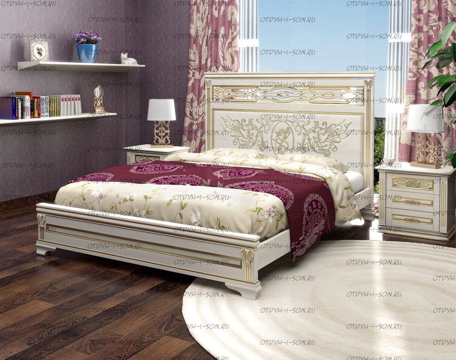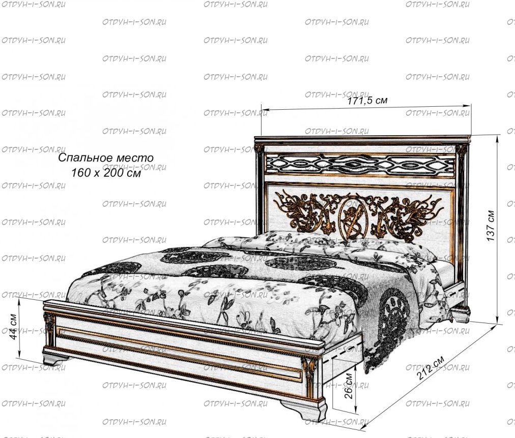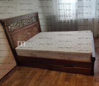 Кровать Линария Характеристики: Размер спального места: 80х190/195/200, 90х190/195/200, 120х190/195/200, 140х190/195/200, 160х190/195/200, 180х190/195/200, 200х190/195/200 см. Комбинированная кровать: Массив сосны и вставки из экологически чистой мебельной фанеры Спинка в изголовье имеет резные элементы с художественной резьбой Габариты кроватей: Высота днища кроватей: Высота от пола до спального места: 25 см. Высота от пола до царги: 19 см. Ширина царги - 16 см., из них 10 см. составляет бортик, который держит матрас, остальные 6 см. под спальным местом, закрывают собой фурнитуру Основание кровати: да, в комплекте Подкроватные ящики: за дополнительную плату Ящики изготавливаются на колесиках и не прикрепляются к кровати, поэтому могут устанавливаться "лицом" к любой из боковыйх сторон кровати. Высота спинки в изголовье кровати: Крепления кровати: В базовом варианте с тыльной стороны ящиков декоративной планки не предусмотрено. Вес: 45-60кг. Любые размеры, в том числе и нестандартные Цвет: венге 1, венге 2, венге 3, венге 4, венге тон 2, коричневый тон 2, коричневый 1, коричневый 2, коричневый 3, коричневый 4, красно-коричневый тон 2, красно-коричневый 1, красно-коричневый 2, красно-коричневый 3, красно-коричневый 4, лак Изготовление из массива березы плюс 30% Изготовление в белом цвете или слоновая кость плюс 20%