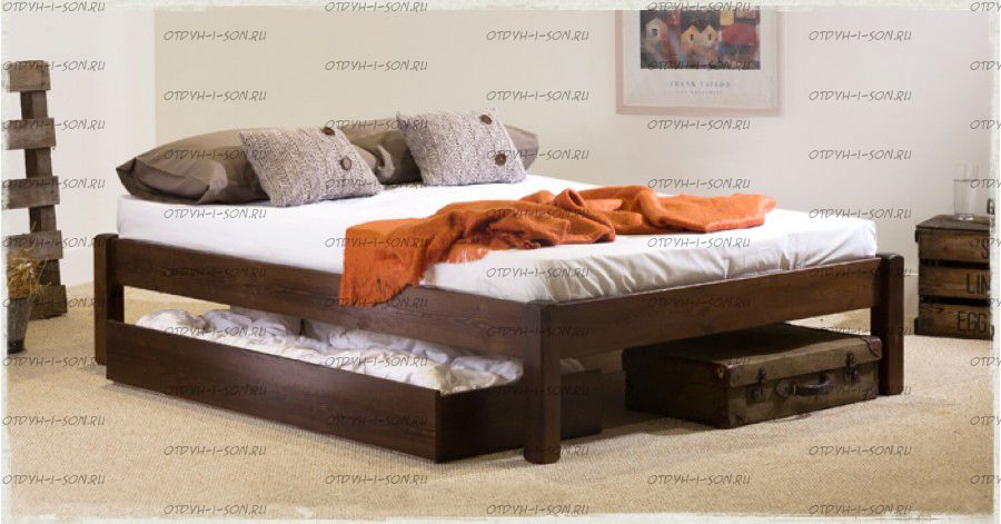В базовом исполнении основание у кровати - поперечные брусья и лист оргалита. Также можно купить кровать вместе с ламельным основанием от Фабрики ВМК Шале и выкатными ящиками. Выкатные ящики сделают кровать еще более функциональной. Они не закрепляются в кровати и поэтому могут выполняться открыванием в любую из сторон кровати. Ламельные основания от фабрики ВМК Шале изготавливаются из гнутых ламелей в металлическом основании (4 ножки).