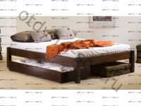 В базовом исполнении основание у кровати - поперечные брусья и лист оргалита. Также можно купить кровать вместе с ламельным основанием от Фабрики ВМК Шале и выкатными ящиками. Выкатные ящики сделают кровать еще более функциональной. Они не закрепляются в кровати и поэтому могут выполняться открыванием в любую из сторон кровати. Ламельные основания от фабрики ВМК Шале изготавливаются из гнутых ламелей в металлическом основании (4 ножки).