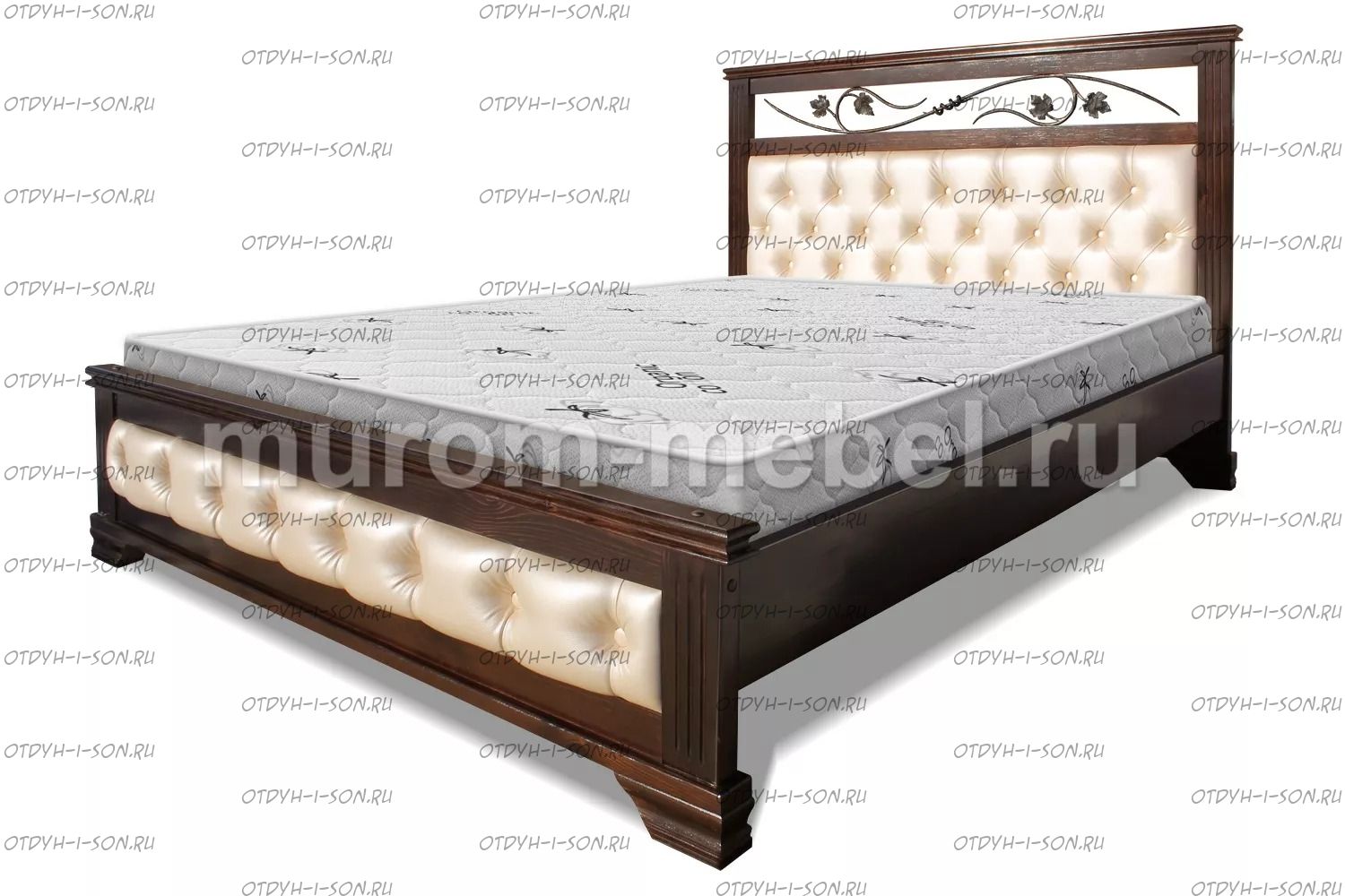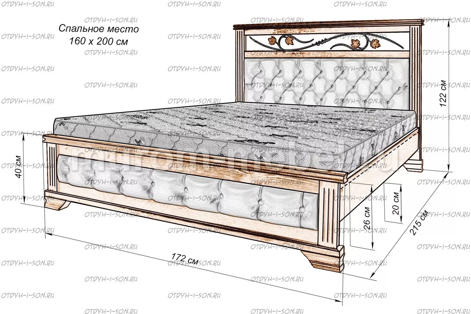 Кровать Лозанна с ковкой Характеристики: Размер спального места: 80х190/195/200, 90х190/195/200, 120х190/195/200, 140х190/195/200, 160х190/195/200, 180х190/195/200, 200х190/195/200 см. Массив дуба Габариты кроватей: Высота днища кроватей: Высота от пола до спального места: 26 см. Высота от пола до царги: 20 см. Ширина царги - 20 см., из них 10 см. составляет бортик, который держит матрас, остальные 6 см. под спальным местом, закрывают собой фурнитуру Основание кровати: да, в комплекте Подкроватные ящики: за дополнительную плату Ящики изготавливаются на колесиках и не прикрепляются к кровати, поэтому могут устанавливаться "лицом" к любой из боковых сторон кровати. Высота спинки в изголовье кровати: 122 см, ножная 40 см Крепления кровати: В базовом варианте с тыльной стороны ящиков декоративной планки не предусмотрено. Вес: 45-60кг. Любые размеры, в том числе и нестандартные Цвет: венге 1, венге 2, венге 3, венге 4, венге тон 2, коричневый тон 2, коричневый 1, коричневый 2, коричневый 3, коричневый 4, красно-коричневый тон 2, красно-коричневый 1, красно-коричневый 2, красно-коричневый 3, красно-коричневый 4, лак Изготовление в белом цвете или слоновая кость плюс 25%
