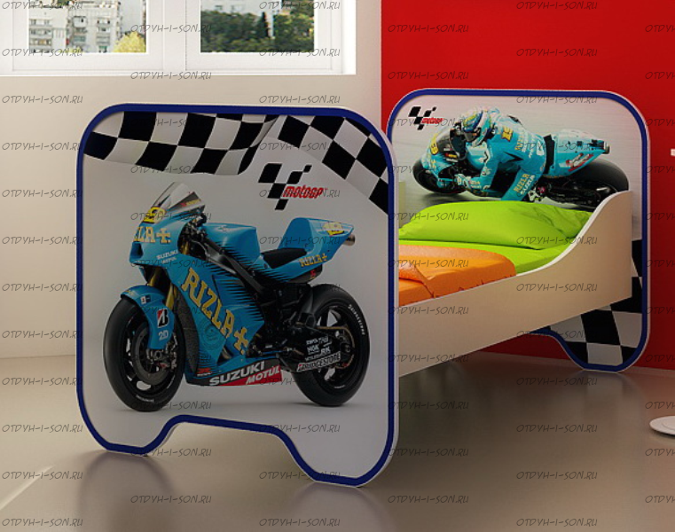 Кровать Мотогонки КР-6 (80х160) Характеристики: Размер спального места: 80х160 см Внешние габариты: 840х1650х840 мм. Расстояние от пола до верхней точки царги в узком месте 420 мм. Расстояние от пола до ламелей 360 мм. Ширина царги 170 мм. в узком месте Расстояние от спального места до верхней точки царги в узком месте 50-60 мм. Материал: ЛДСП австрийской компании Эггер. Толщина 16 мм; металлические крепления; Европейская фурнитура; наклейки. Цвет корпуса: крем ваниль