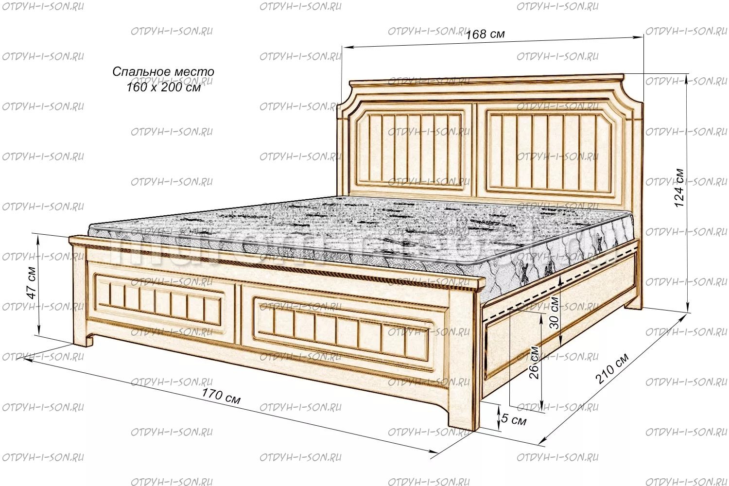 Кровать Офелия Характеристики: Размер спального места: 80х190/195/200, 90х190/195/200, 120х190/195/200, 140х190/195/200, 160х190/195/200, 180х190/195/200, 200х190/195/200 см. Комбинированная кровать: Массив дерева Габариты кроватей: Высота днища кроватей: Высота от пола до спального места: 26 см. Высота от пола до царги: 5 см. Ширина царги - 30 см., из них 10 см. составляет бортик, который держит матрас, остальные 6 см. под спальным местом, закрывают собой фурнитуру Основание кровати: да, в комплекте Подкроватные ящики: за дополнительную плату Ящики изготавливаются на колесиках и не прикрепляются к кровати, поэтому могут устанавливаться "лицом" к любой из боковых сторон кровати. Высота спинки в изголовье кровати: 124 см, ножная 47 см Крепления кровати: В базовом варианте с тыльной стороны ящиков декоративной планки не предусмотрено. Вес: 45-60кг. Любые размеры, в том числе и нестандартные Цвет: венге 1, венге 2, венге 3, венге 4, венге тон 2, коричневый тон 2, коричневый 1, коричневый 2, коричневый 3, коричневый 4, красно-коричневый тон 2, красно-коричневый 1, красно-коричневый 2, красно-коричневый 3, красно-коричневый 4, лак Изготовление из массива березы плюс 30% Изготовление в белом цвете или слоновая кость плюс 20%