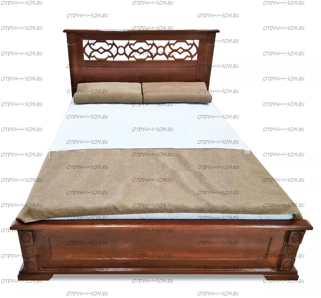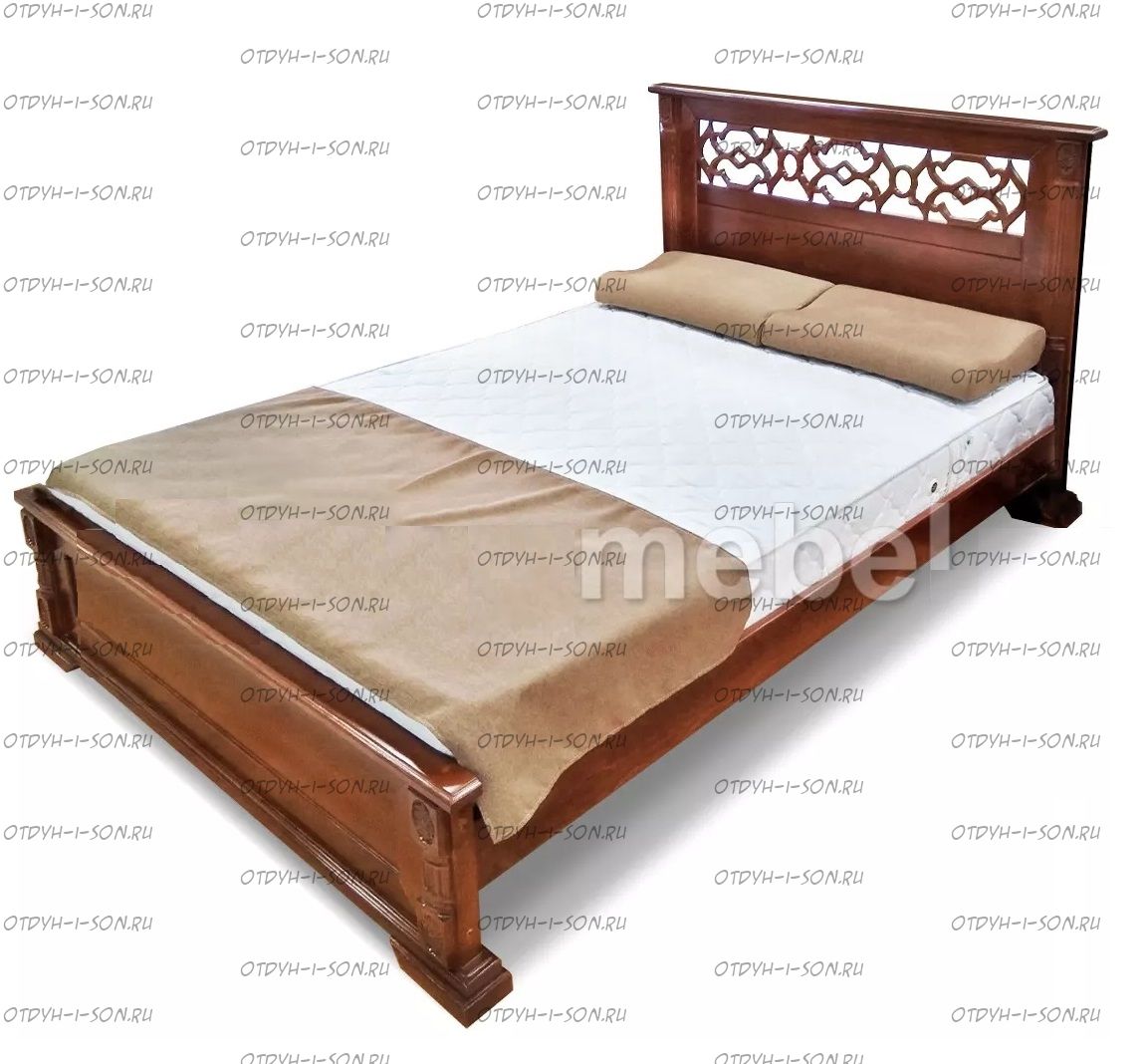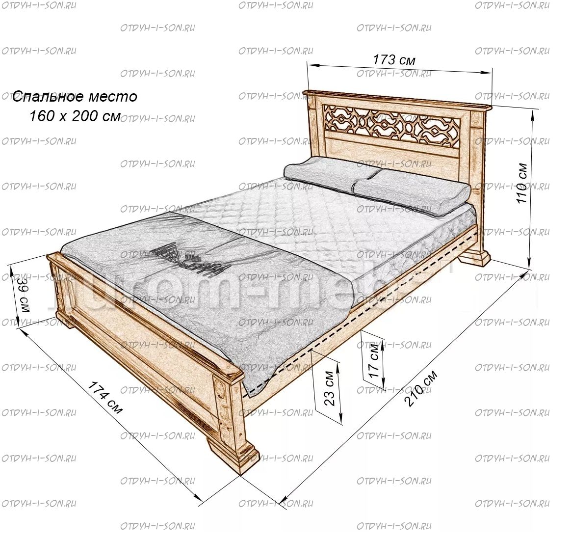 Кровать Пальмира Характеристики: Размер спального места: 80х190/195/200, 90х190/195/200, 120х190/195/200, 140х190/195/200, 160х190/195/200, 180х190/195/200, 200х190/195/200 см. Комбинированная кровать: Массив сосны и вставки из экологически чистой мебельной фанеры Спинка в изголовье имеет резные элементы с художественной резьбой Габариты кроватей: Высота днища кроватей: Высота от пола до спального места: 23 см. Высота от пола до царги: 17 см. Ширина царги - 16 см., из них 10 см. составляет бортик, который держит матрас, остальные 6 см. под спальным местом, закрывают собой фурнитуру Основание кровати: да, в комплекте Подкроватные ящики: за дополнительную плату Ящики изготавливаются на колесиках и не прикрепляются к кровати, поэтому могут устанавливаться "лицом" к любой из боковыйх сторон кровати. Высота спинки в изголовье кровати: 110 см, ножная 39 см Крепления кровати: В базовом варианте с тыльной стороны ящиков декоративной планки не предусмотрено. Вес: 45-60кг. Любые размеры, в том числе и нестандартные Цвет: венге 1, венге 2, венге 3, венге 4, венге тон 2, коричневый тон 2, коричневый 1, коричневый 2, коричневый 3, коричневый 4, красно-коричневый тон 2, красно-коричневый 1, красно-коричневый 2, красно-коричневый 3, красно-коричневый 4, лак Изготовление из массива березы плюс 30% Изготовление в белом цвете или слоновая кость плюс 20%
