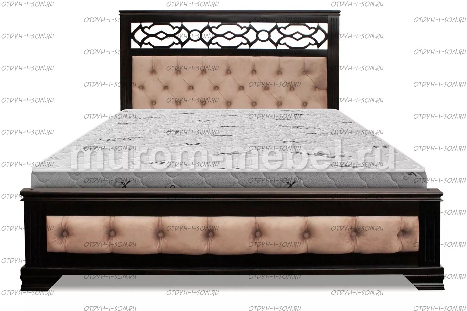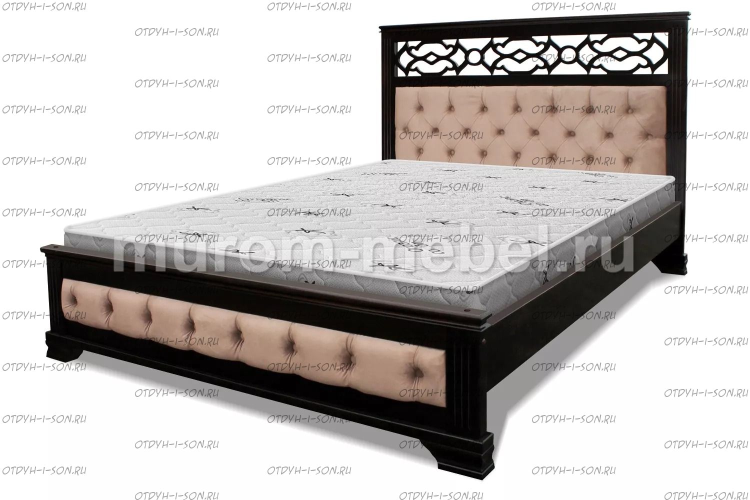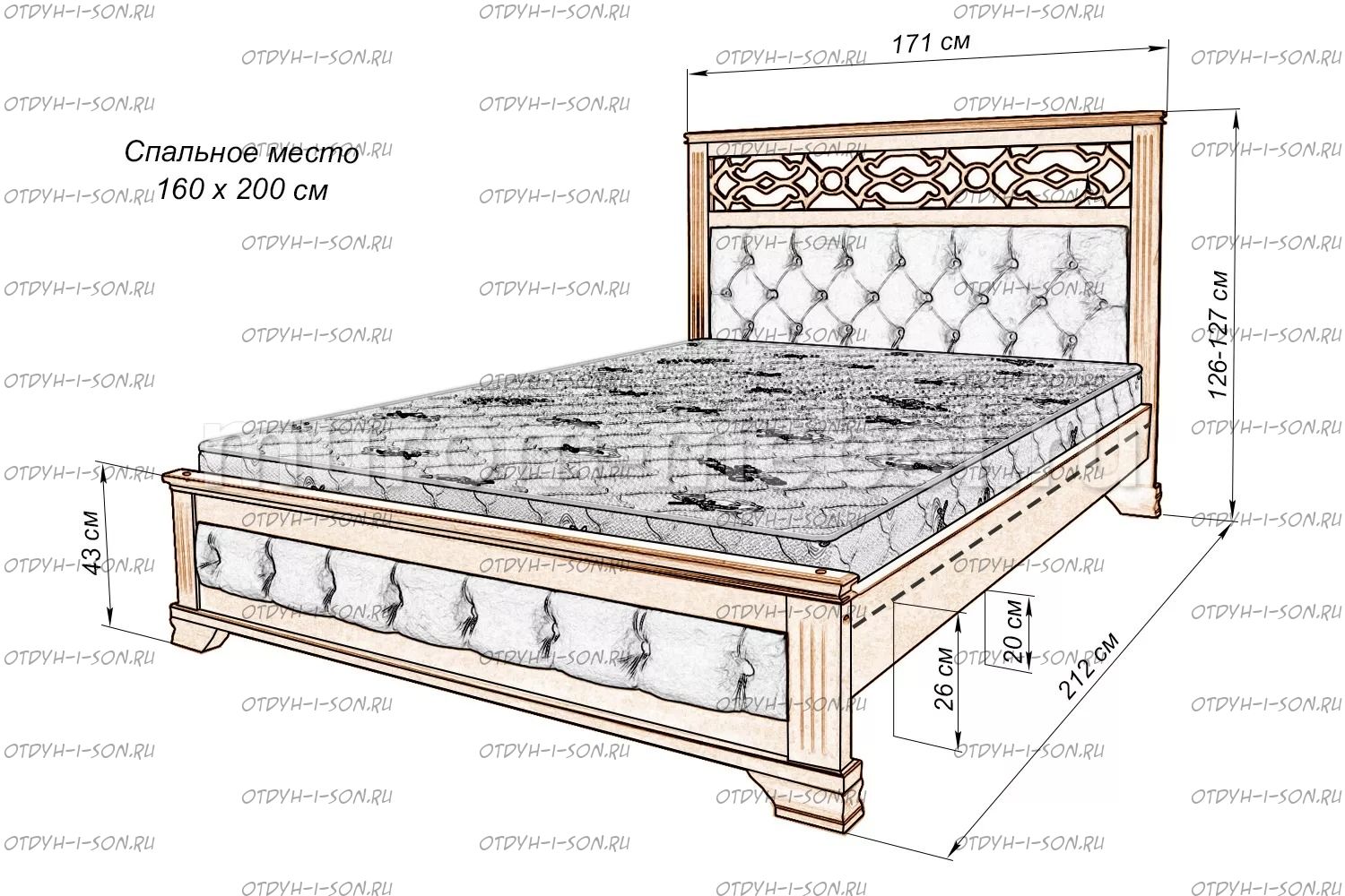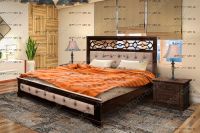 Кровать Пальмира с мягкой вставкой Характеристики: Размер спального места: 80х190/195/200, 90х190/195/200, 120х190/195/200, 140х190/195/200, 160х190/195/200, 180х190/195/200, 200х190/195/200 см. Комбинированная кровать: Массив сосны и вставки из экологически чистой мебельной фанеры Спинка в изголовье имеет резные элементы с художественной резьбой Габариты кроватей: Высота днища кроватей: Высота от пола до спального места: 26 см. Высота от пола до царги: 20 см. Ширина царги - 16 см., из них 10 см. составляет бортик, который держит матрас, остальные 6 см. под спальным местом, закрывают собой фурнитуру Основание кровати: да, в комплекте Подкроватные ящики: за дополнительную плату Ящики изготавливаются на колесиках и не прикрепляются к кровати, поэтому могут устанавливаться "лицом" к любой из боковыйх сторон кровати. Высота спинки в изголовье кровати: 127 см, ножная 43 см Крепления кровати: В базовом варианте с тыльной стороны ящиков декоративной планки не предусмотрено. Вес: 45-60кг. Любые размеры, в том числе и нестандартные Цвет: венге 1, венге 2, венге 3, венге 4, венге тон 2, коричневый тон 2, коричневый 1, коричневый 2, коричневый 3, коричневый 4, красно-коричневый тон 2, красно-коричневый 1, красно-коричневый 2, красно-коричневый 3, красно-коричневый 4, лак Изготовление из массива березы плюс 30% Изготовление в белом цвете или слоновая кость плюс 20%