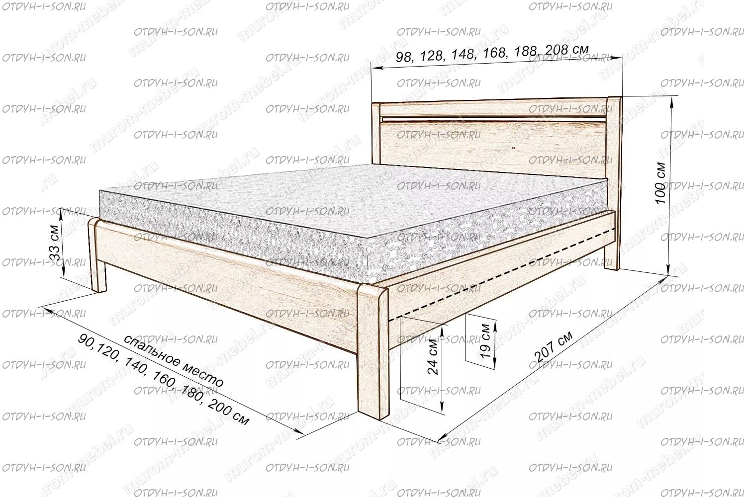 Кровать Рамона Характеристики: Размер спального места: 80х190/195/200, 90х190/195/200, 120х190/195/200, 140х190/195/200, 160х190/195/200, 180х190/195/200, 200х190/195/200 см. Комбинированная кровать: Массив дерева и вставки из экологически чистой мебельной фанеры Габариты кроватей: Высота днища кроватей: Высота от пола до спального места: 24 см. Высота от пола до царги: 19 см. Ширина царги - см., из них 10 см. составляет бортик, который держит матрас, остальные 6 см. под спальным местом, закрывают собой фурнитуру Основание кровати: да, в комплекте Подкроватные ящики: за дополнительную плату Ящики изготавливаются на колесиках и не прикрепляются к кровати, поэтому могут устанавливаться "лицом" к любой из боковых сторон кровати. Высота спинки в изголовье кровати: 100 см, ножная 33 см Крепления кровати: В базовом варианте с тыльной стороны ящиков декоративной планки не предусмотрено. Вес: 45-60кг. Любые размеры, в том числе и нестандартные Цвет: венге 1, венге 2, венге 3, венге 4, венге тон 2, коричневый тон 2, коричневый 1, коричневый 2, коричневый 3, коричневый 4, красно-коричневый тон 2, красно-коричневый 1, красно-коричневый 2, красно-коричневый 3, красно-коричневый 4, лак Изготовление из массива березы плюс 30% Изготовление в белом цвете или слоновая кость плюс 20%