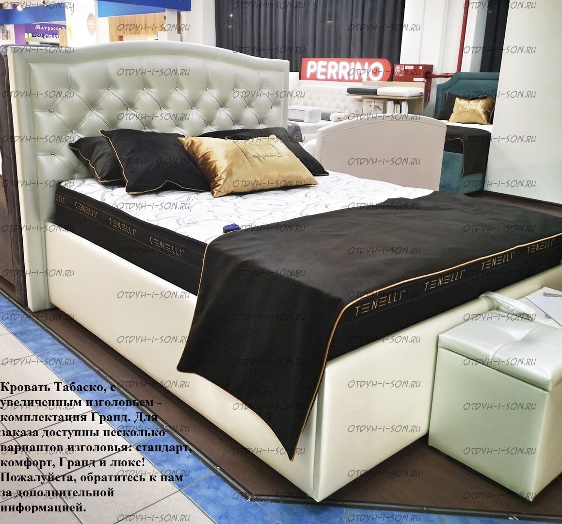 | Внимание | Кровати Perrino 3.0 могут быть выполнены в нескольких вариантах изголовья: Стандарт, Комфорт, Гранд, Люкс, также можно за доплату к декору кровати добавить: пуговицы, стразы или жемчуг! |