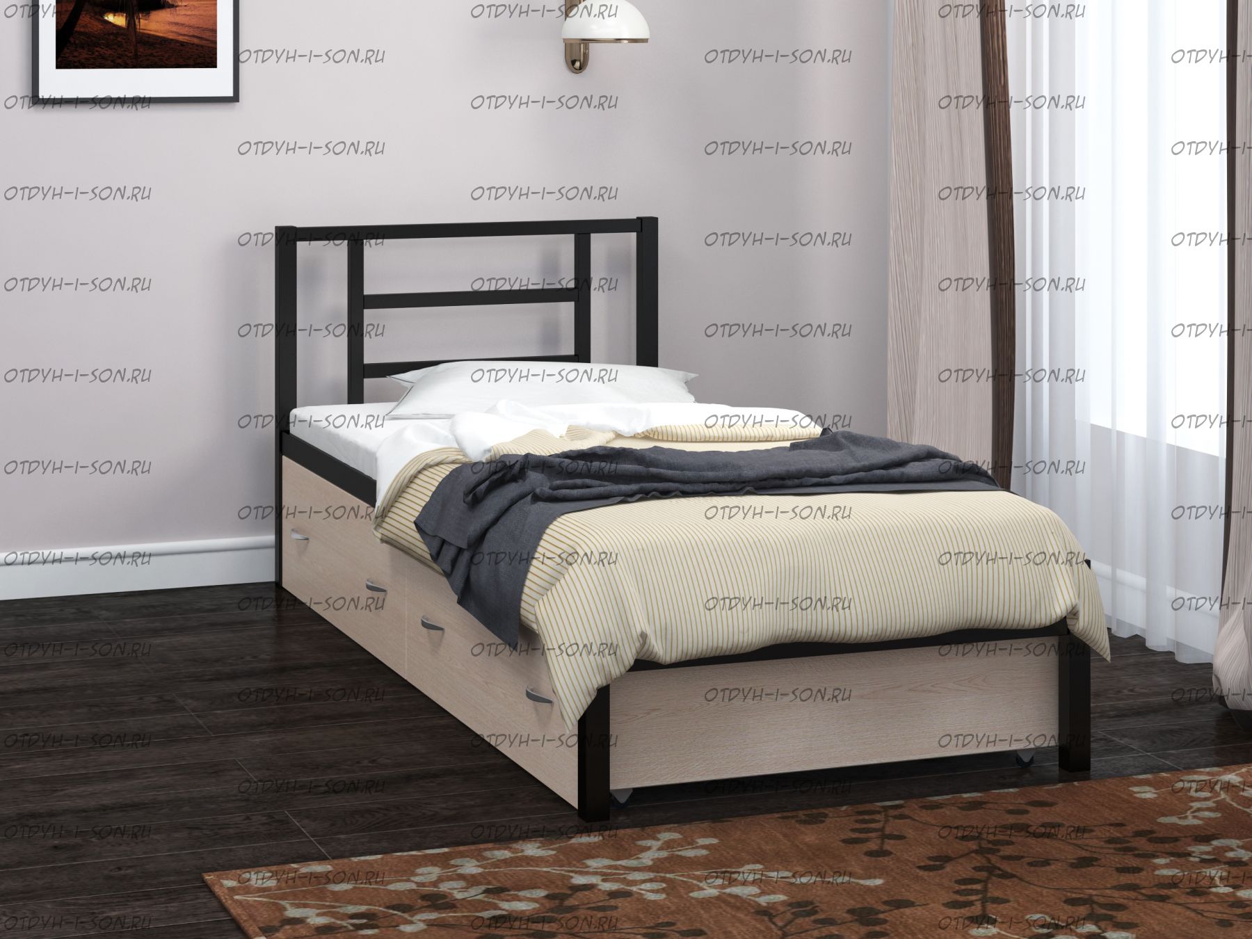 Кровать Титан Лофт 90 Характеристики: Спальное место (см): 90х190, Нагрузка на одно спальное место односпальной кровати: 150 кг. Нагрузка на одно спальное место для двуспальной кровати: 200 кг. Внешние размеры (ШхДхВ): 96 х 198 х 80 см.