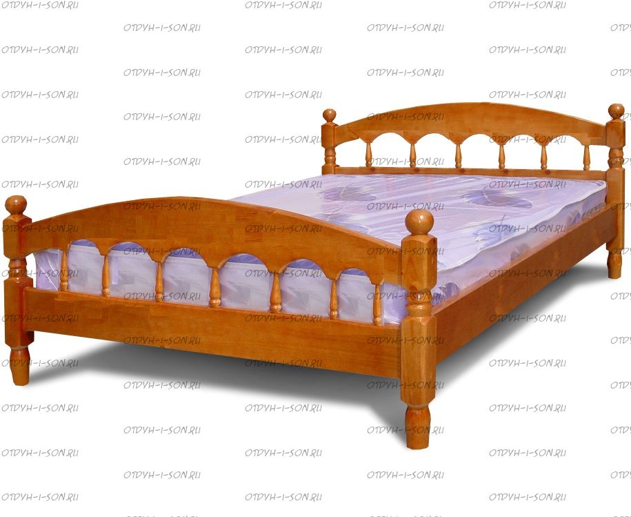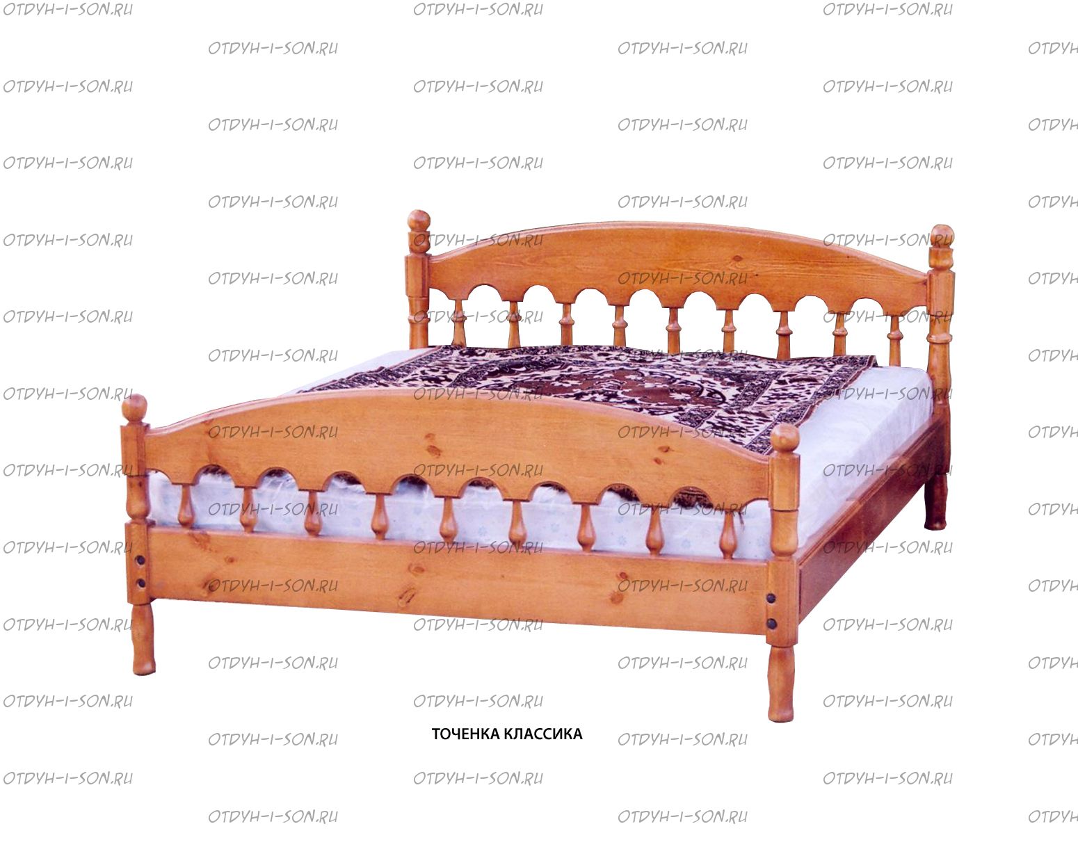 Кровать Точенка Классика Характеристики: Размер спального места: 80х190/195/200, 90х190/195/200, 120х190/195/200, 140х190/195/200, 160х190/195/200, 180х190/195/200, 200х190/195/200 см. Комбинированная кровать: Массив сосны и вставки из экологически чистой мебельной фанеры Спинка в изголовье имеет резные элементы с художественной резьбой Габариты кроватей: Высота днища кроватей: Высота от пола до спального места: 25 см. Высота от пола до царги: 19 см. Ширина царги - 16 см., из них 10 см. составляет бортик, который держит матрас, остальные 6 см. под спальным местом, закрывают собой фурнитуру Основание кровати: да, в комплекте Подкроватные ящики: за дополнительную плату Ящики изготавливаются на колесиках и не прикрепляются к кровати, поэтому могут устанавливаться "лицом" к любой из боковыйх сторон кровати. Высота спинки в изголовье кровати: Крепления кровати: В базовом варианте с тыльной стороны ящиков декоративной планки не предусмотрено. Вес: 45-60кг. Любые размеры, в том числе и нестандартные Цвет: венге 1, венге 2, венге 3, венге 4, венге тон 2, коричневый тон 2, коричневый 1, коричневый 2, коричневый 3, коричневый 4, красно-коричневый тон 2, красно-коричневый 1, красно-коричневый 2, красно-коричневый 3, красно-коричневый 4, лак Изготовление из массива березы плюс 30% Изготовление в белом цвете или слоновая кость плюс 20%
