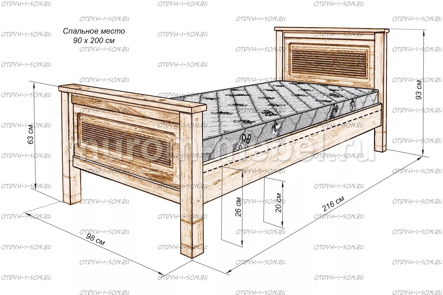 Кровать Фермер Характеристики: Размер спального места: 80х190/195/200, 90х190/195/200, 120х190/195/200, 140х190/195/200, 160х190/195/200, 180х190/195/200, 200х190/195/200 см. Комбинированная кровать: Массив дерева и вставки из экологически чистой мебельной фанеры Габариты кроватей: Высота днища кроватей: Высота от пола до спального места: 26 см. Высота от пола до царги: 20 см. Ширина царги - 16 см., из них 10 см. составляет бортик, который держит матрас, остальные 6 см. под спальным местом, закрывают собой фурнитуру Основание кровати: подматрасники, ламельное основание - за дополнительную плату Ламельное основание: да, в комплекте Подкроватные ящики: за дополнительную плату Ящики изготавливаются на колесиках и не прикрепляются к кровати, поэтому могут устанавливаться "лицом" к любой из боковых сторон кровати. Высота спинки в изголовье кровати: 93 см, изножье 63 см Крепления кровати: В базовом варианте с тыльной стороны ящиков декоративной планки не предусмотрено. Вес: 45-60кг. Любые размеры, в том числе и нестандартные