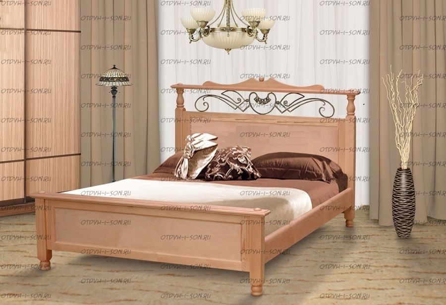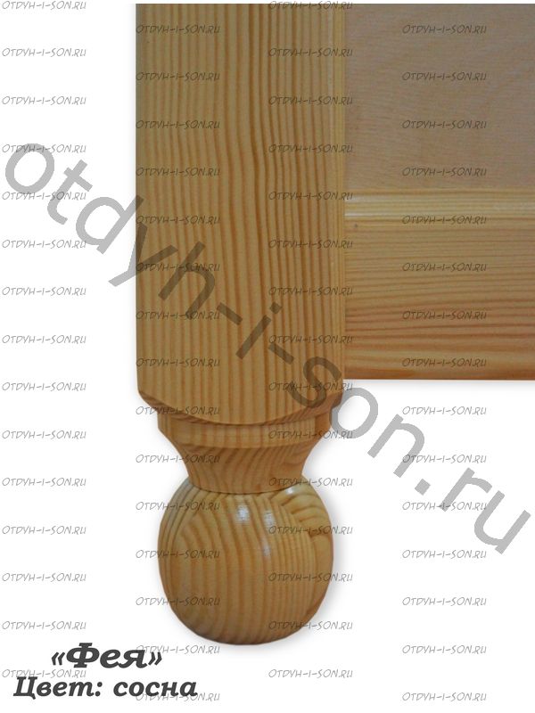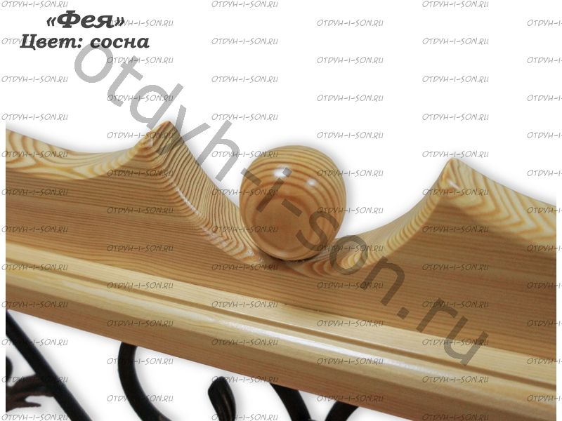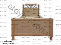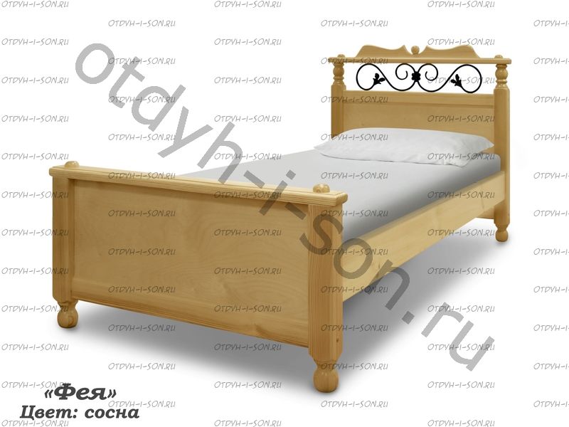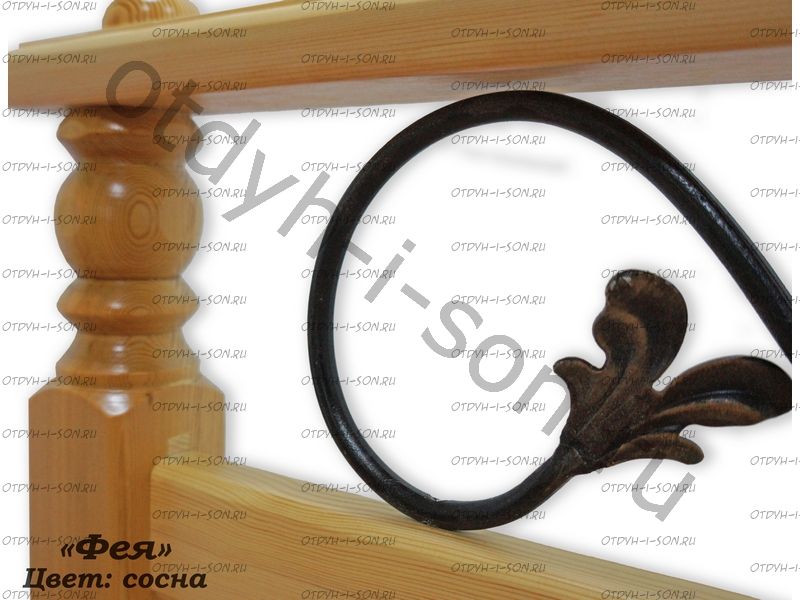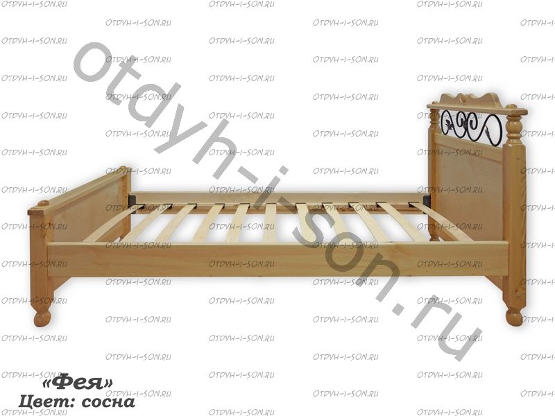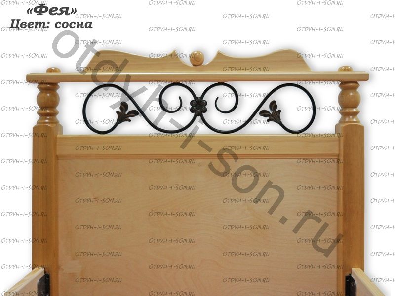 Кровать Фея изготавливается из массива сосны - это экстравагантная деревянная кровать и доступна широкому кругу потребителей. Оригинальность этой кровати в том, что спинка в изголовье декорирована кованными элементами и точёными балясинами. Применяя технологию патирования, ковка может быть не только черного, но и, к примеру, золотого цвета. Филёнки спинок выполняются из берёзовой мебельной фанеры толщиной 12 мм.