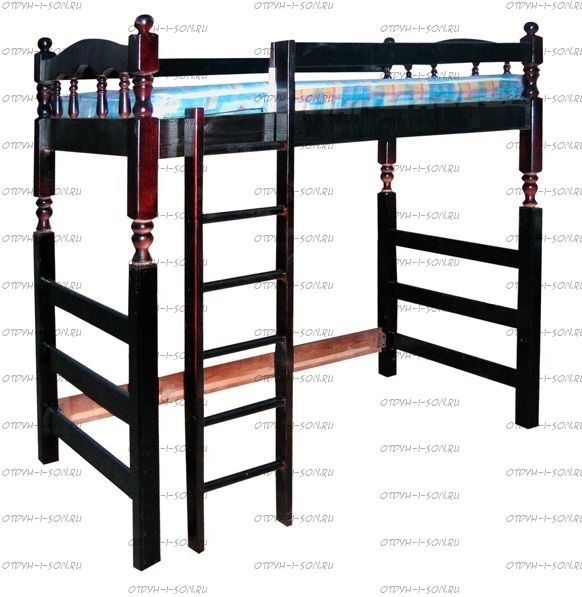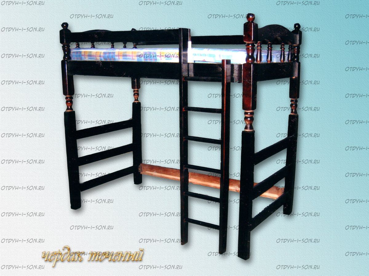 Кровать-Чердак (Муром) Характеристики: Размеры спального места: любые Внешние габариты: + 12 см. к длине спального места. Толщина бруса: 6 см. Высота до спального места/царги: 125/122 см. Возможно изготовление кровати нужной высоты по запросу. Материалы: Массив сосны Спинка в изголовье имеет резные элементы с художественной резьбой Габариты кроватей: Высота днища кроватей: Основание кровати: Ламельное основание: за дополнительную плату Подкроватные ящики: за дополнительную плату Ящики изготавливаются на колесиках и не прикрепляются к кровати, поэтому могут устанавливаться "лицом" к любой из боковых сторон кровати. Высота от пола до спального места: 122-123 см Высота спинки в изголовье кровати: Крепления кровати: В базовом варианте с тыльной стороны ящиков декоративной планки не предусмотрено. Вес: 45-60кг. Любые размеры, в том числе и нестандартные Цвет: венге 1, венге 2, венге 3, венге 4, венге тон 2, коричневый тон 2, коричневый 1, коричневый 2, коричневый 3, коричневый 4, красно-коричневый тон 2, красно-коричневый 1, красно-коричневый 2, красно-коричневый 3, красно-коричневый 4, лак Изготовление из массива березы плюс 30% Изготовление в белом цвете или слоновая кость плюс 20%