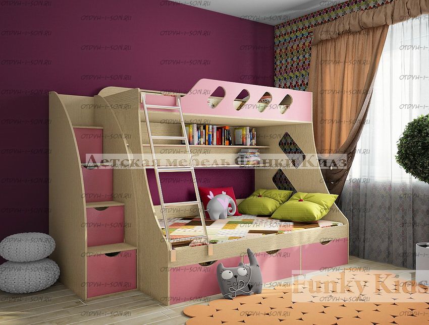 Кровать двухъярусная Фанки Кидз 16 ФМ + лестница-комод 13/8 СВ Комплектация: Двухъярусная кровать Фанки 16 Лестница-комод 13/8 СВ Характеристики: Размер спального места: 90х190 и 120х190 Внешние габариты без учета лестницы (ШхДхВ): 1266х1960х1600 Материал: ЛДСП 16 мм (Австрия, Egger). Цвет корпуса: Ольха, Венге, Орех, Дуб кремона Цвет фасада: Розовый, Оранжевый, Крем ваниль, Салатовый, Дуб кремона, Голубой, Венге, Ольха, Орех