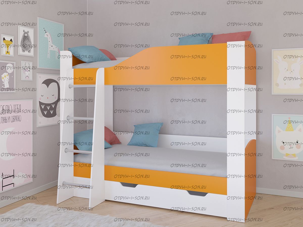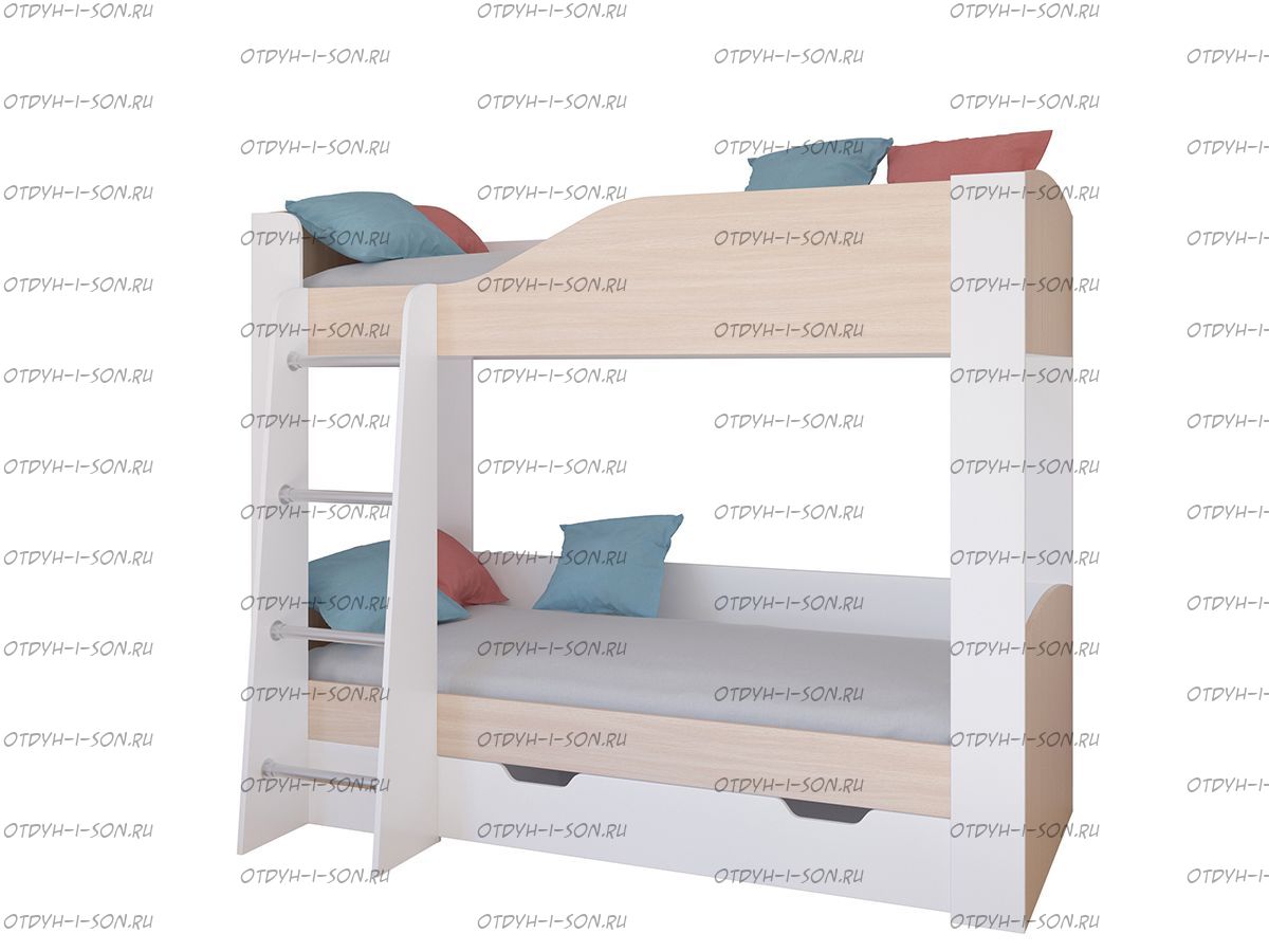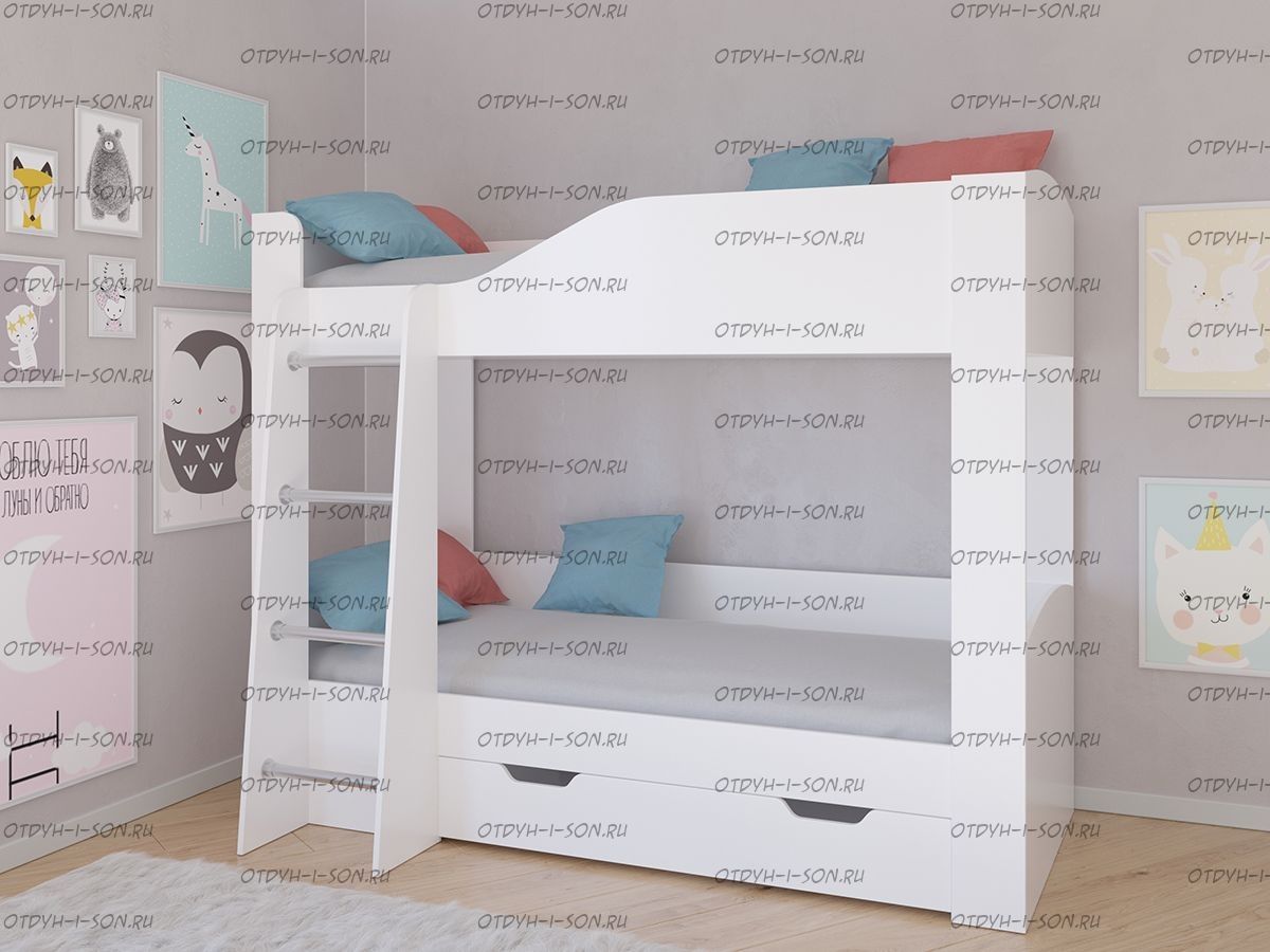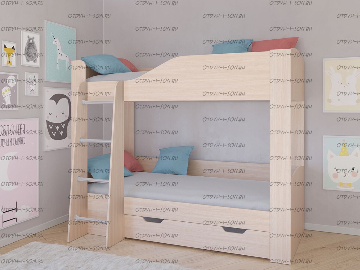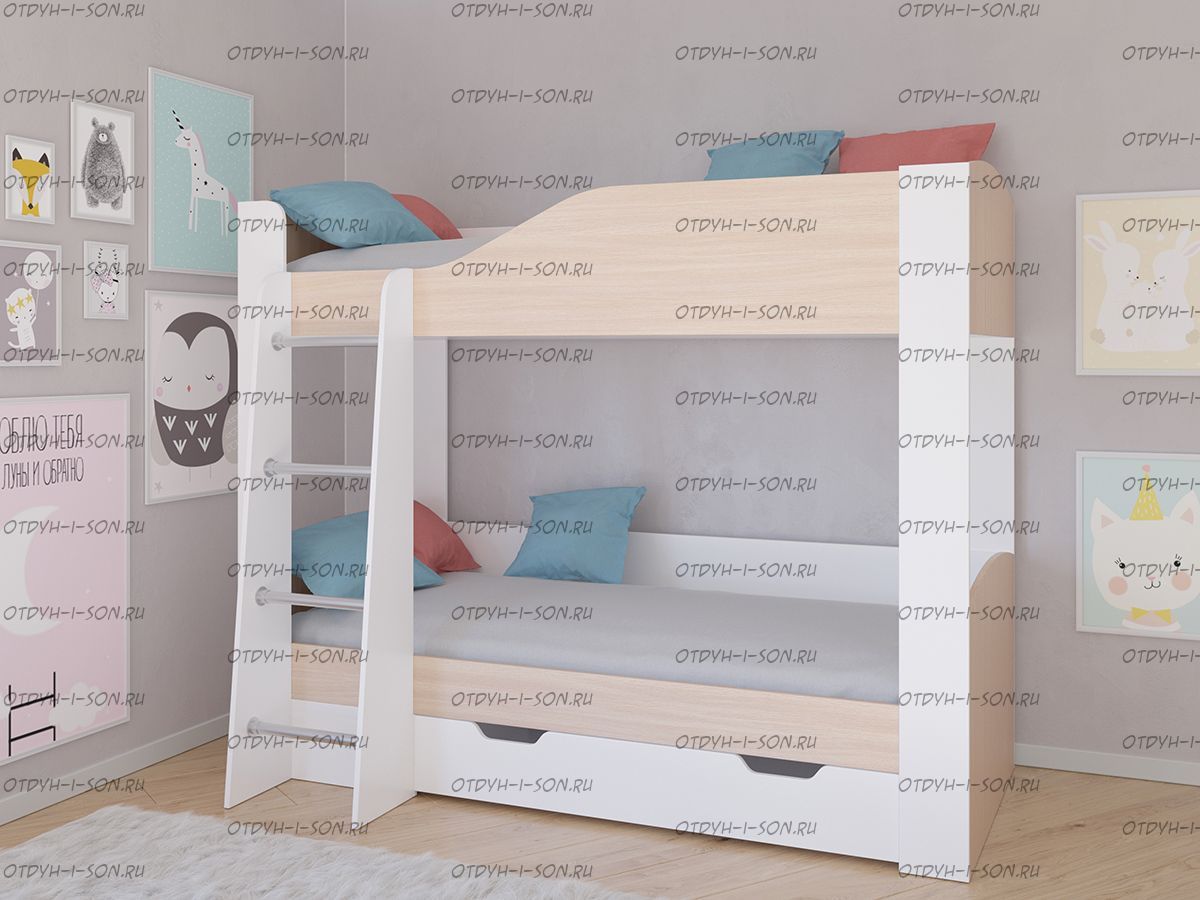 Кровать двухъярусная Астра-2 с ящиком. Детская двухъярусная кровать "АСТРА-2" — это 2 полноценных спальных места для Ваших малышей! Продуманная система хранения, которая есть не в каждой двухъярусной кровати, порадует Вас и Вашего ребенка, а различные цветовые решения помогут вписать эту детскую в любой интерьер.