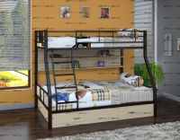 Кровать двухъярусная Гранада-1 ПЯ с подкроватными ящиками и полкой Комплектация: Кровать двухъярусная (1 шт.) Подкроватные ящики (2 шт.) Навесной стеллаж / полка (1 шт.) Характеристики: Размер верхнего спального места: 90Х190 см. Размер нижнего спального места: 120х190 см Внешние габариты (ДхШхВ): 1980х1260х1620 см. Материалы каркаса: металл Размер трубы каркаса: 40х40 мм. Основание кровати из металлических лаг шириной 40 мм., расположенных на расстоянии 12,5 см. друг от друга Вес: 97 кг Максимальная нагрузка на спальное место: 200 кг Кровать поставляется в разобранном виде Цвет: черный, коричневый, серый, слоновая кость