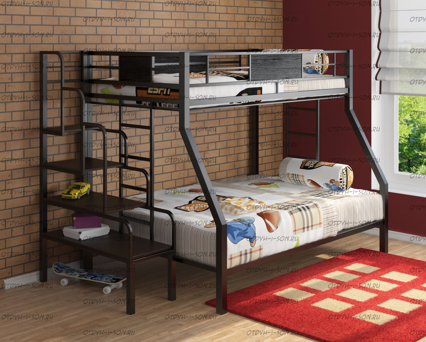 Кровать двухъярусная Гранада. Характеристики: Размер верхнего спального места: 90Х190 см. Размер нижнего спального места: 120х190 см Внешние габариты (ДхШхВ) без лестницы: 1980х1260х1620 см. Внешние габариты (ДхШхВ) с лестницей: 2380х1260х1620 см. Материалы каркаса: металл Размер трубы каркаса: 40х40 мм. Вес: 70 кг. Объем: 0,4 м3 Максимальная нагрузка на спальное место: 200 кг Кровать поставляется в разобранном виде Цвет: черный, коричневый, серый, слоновая кость