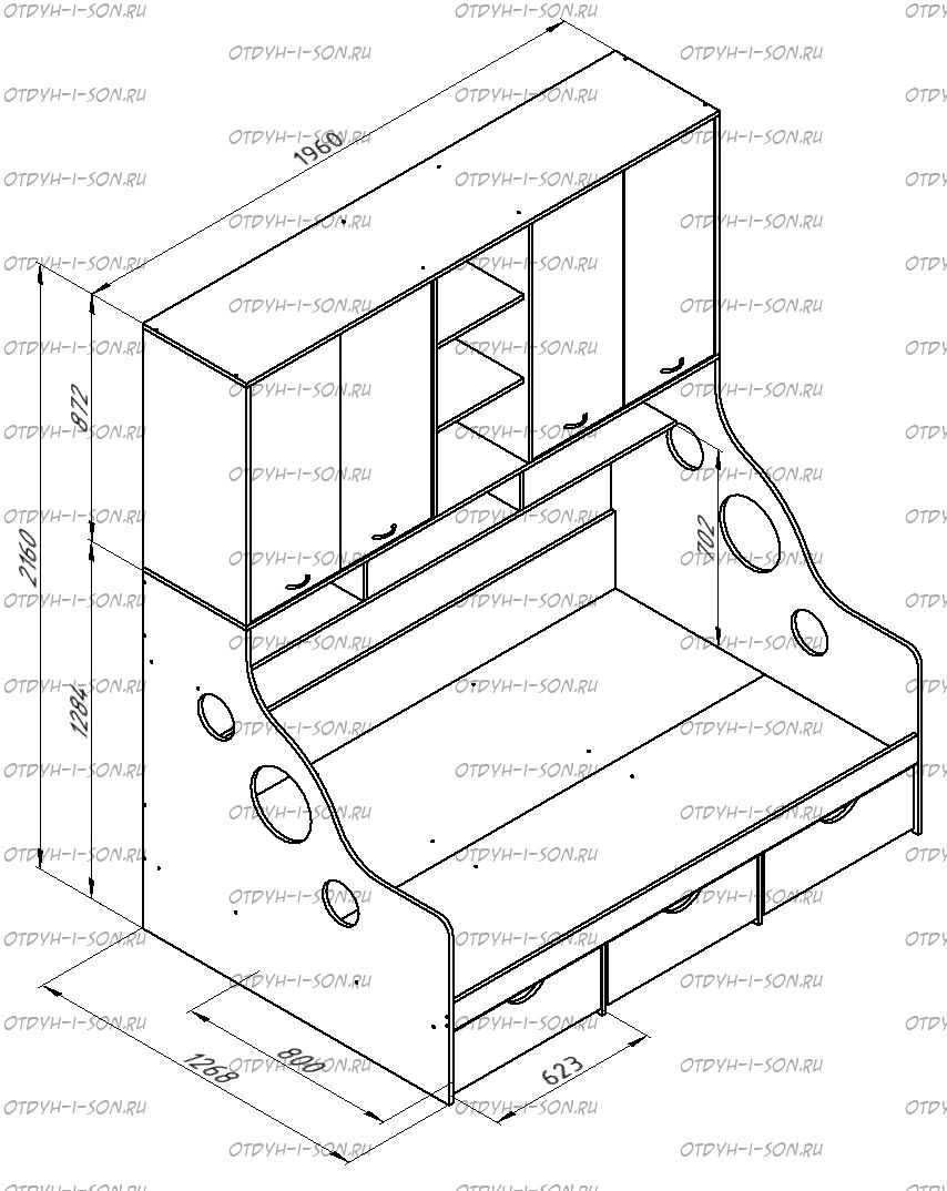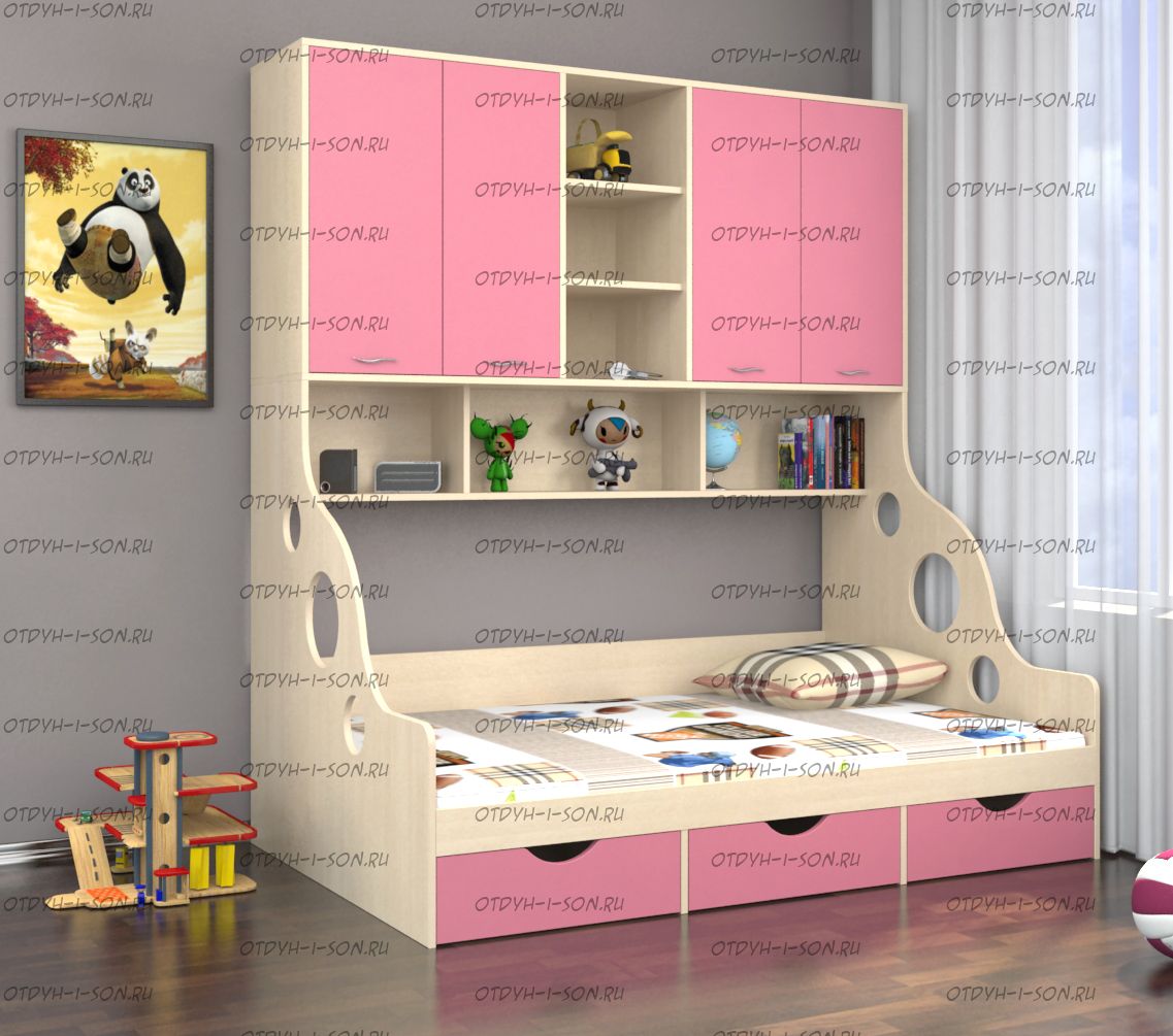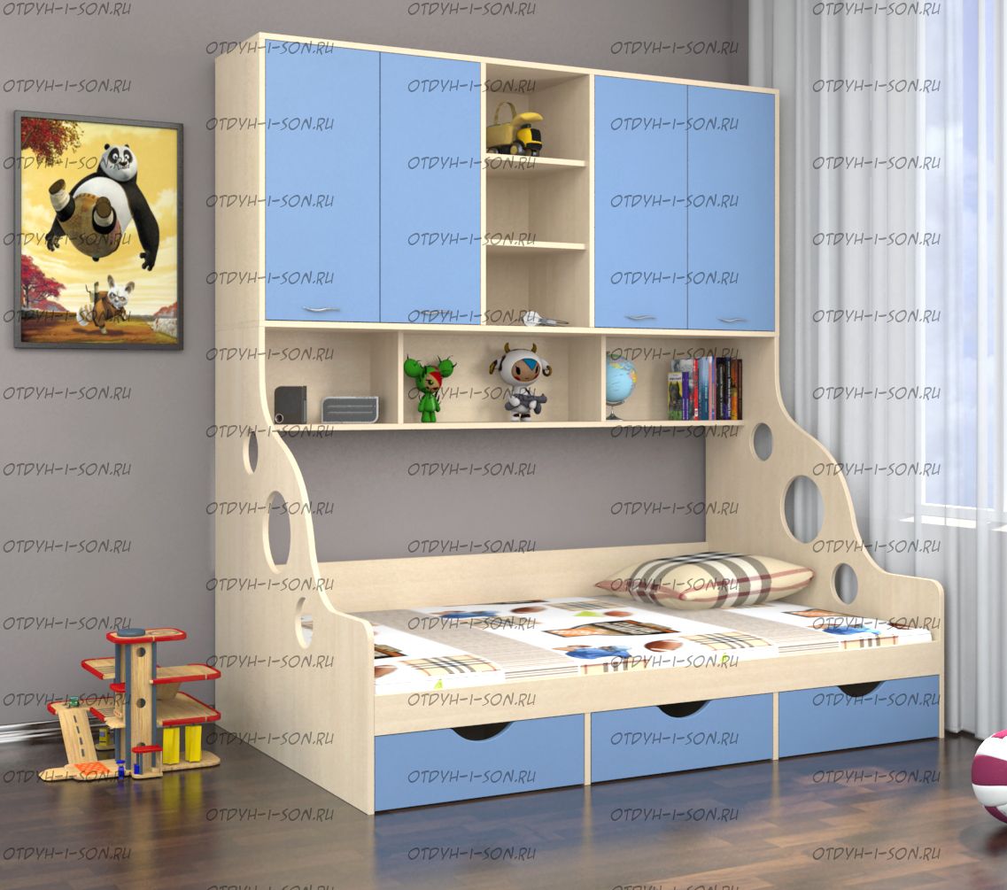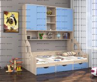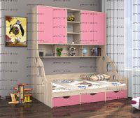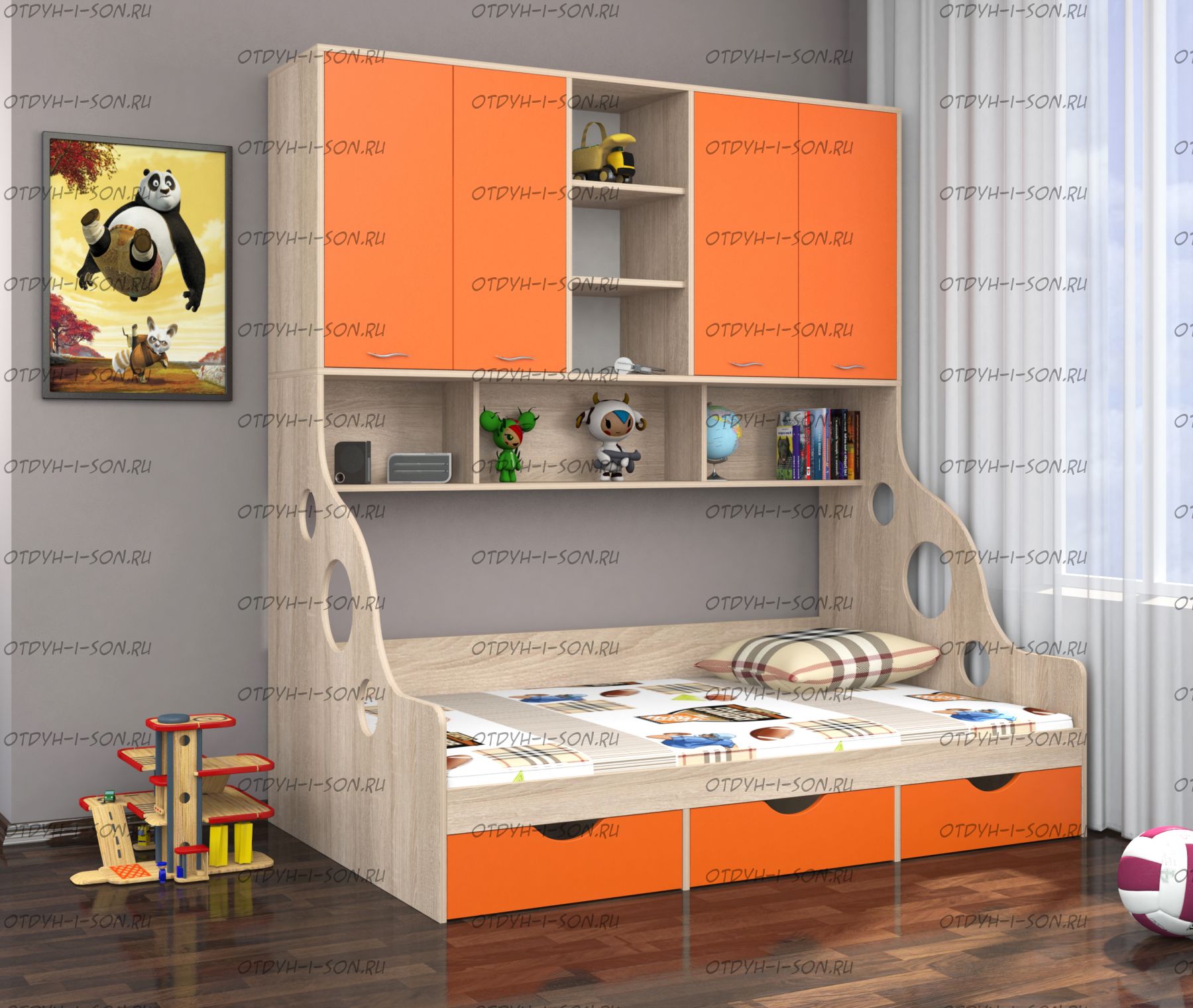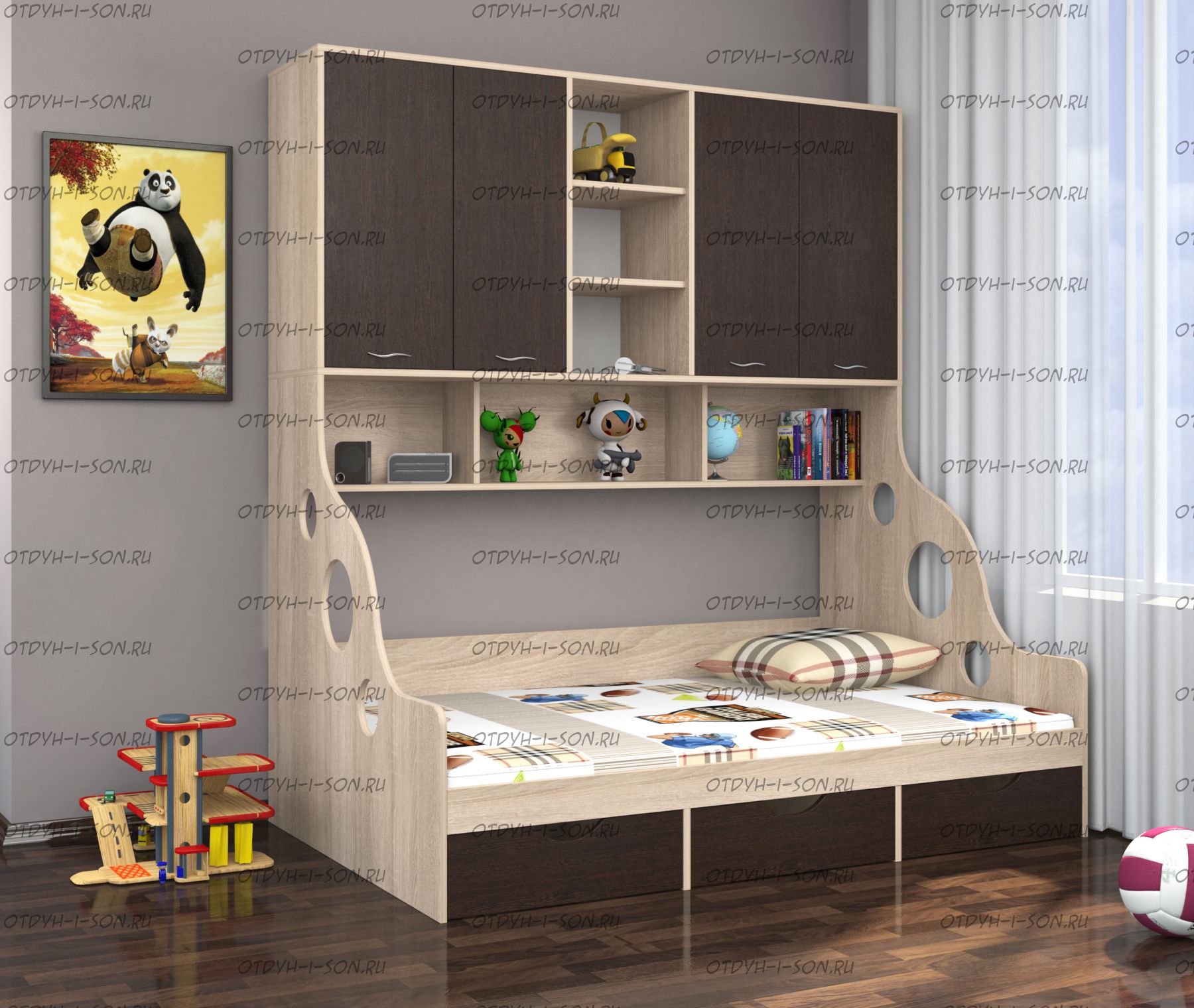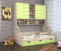 Кровать с антресолью Дельта 21.01 (ширина спального места 120) Характеристики: Размер спального места: 120Х190см Внешние габариты (ДхШхВ): 127х196х216 см. Материалы: ламинированная ДСП 16 мм. Кромка ПВХ толщиной 2 мм производства «Rehau» (Германия) Кровать поставляется в разобранном виде Цвета корпуса: дуб молочный, дуб сонома, венге, орех Цвета фасадов: ольха, оранжевый, орех, дуб молочный, голубой, салатовый, крем ваниль, розовый, салатовый, венге, зеленый текстиль, желтый