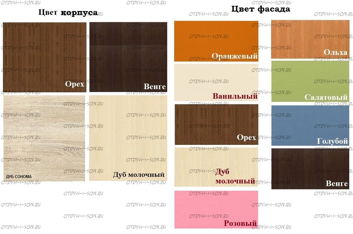 Доступные цвета: Корпус: Дуб молочный, Дуб сонома, Венге, Орех, Белый; Фасады: Белый, Желтый, Ольха, Оранжевый, Орех, Дуб молочный, Голубой, Салатовый, Крем ваниль, Розовый, Венге, Зеленый текстиль |