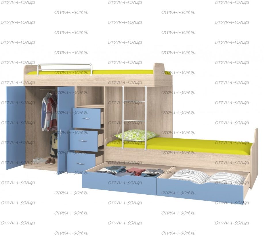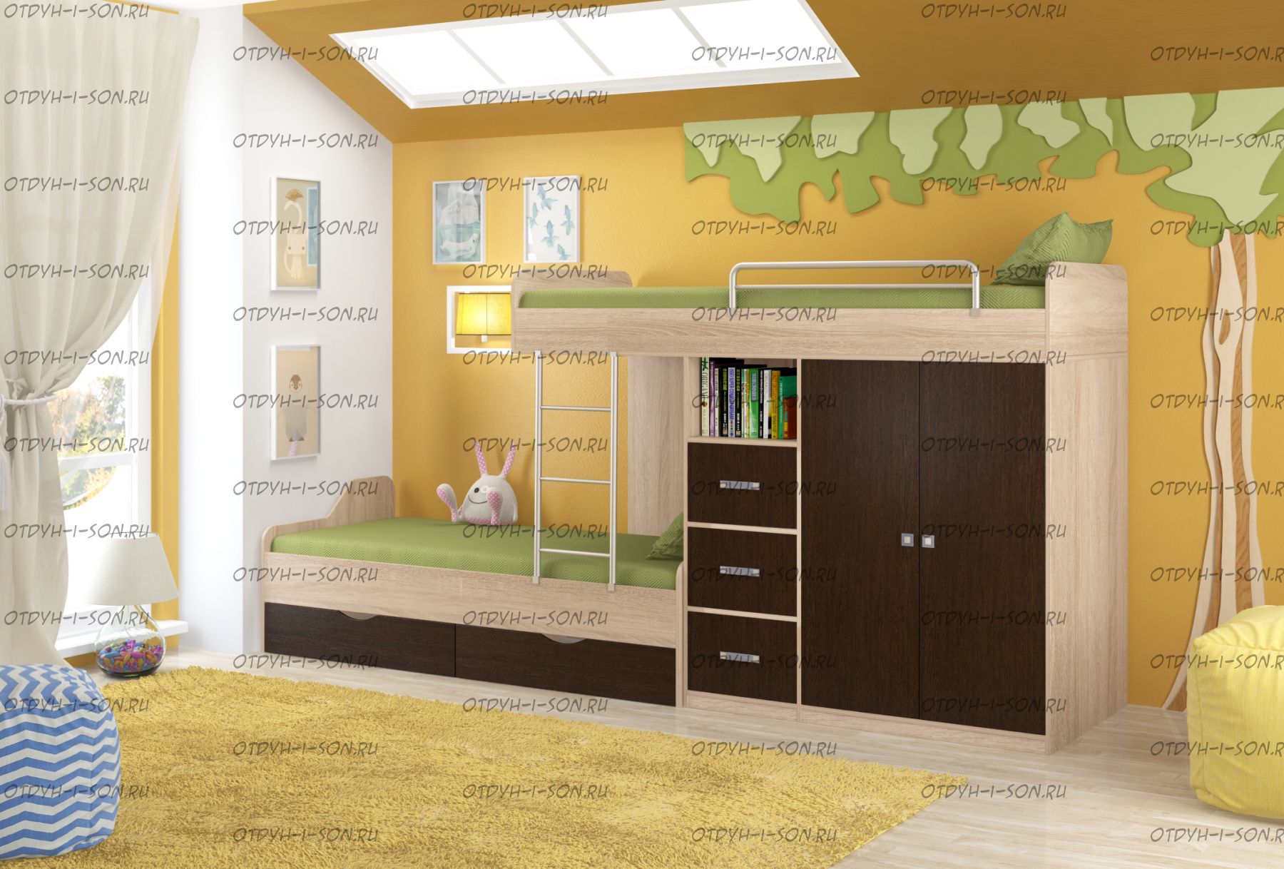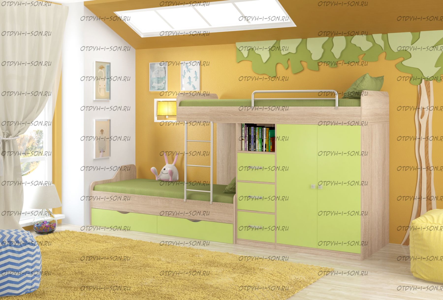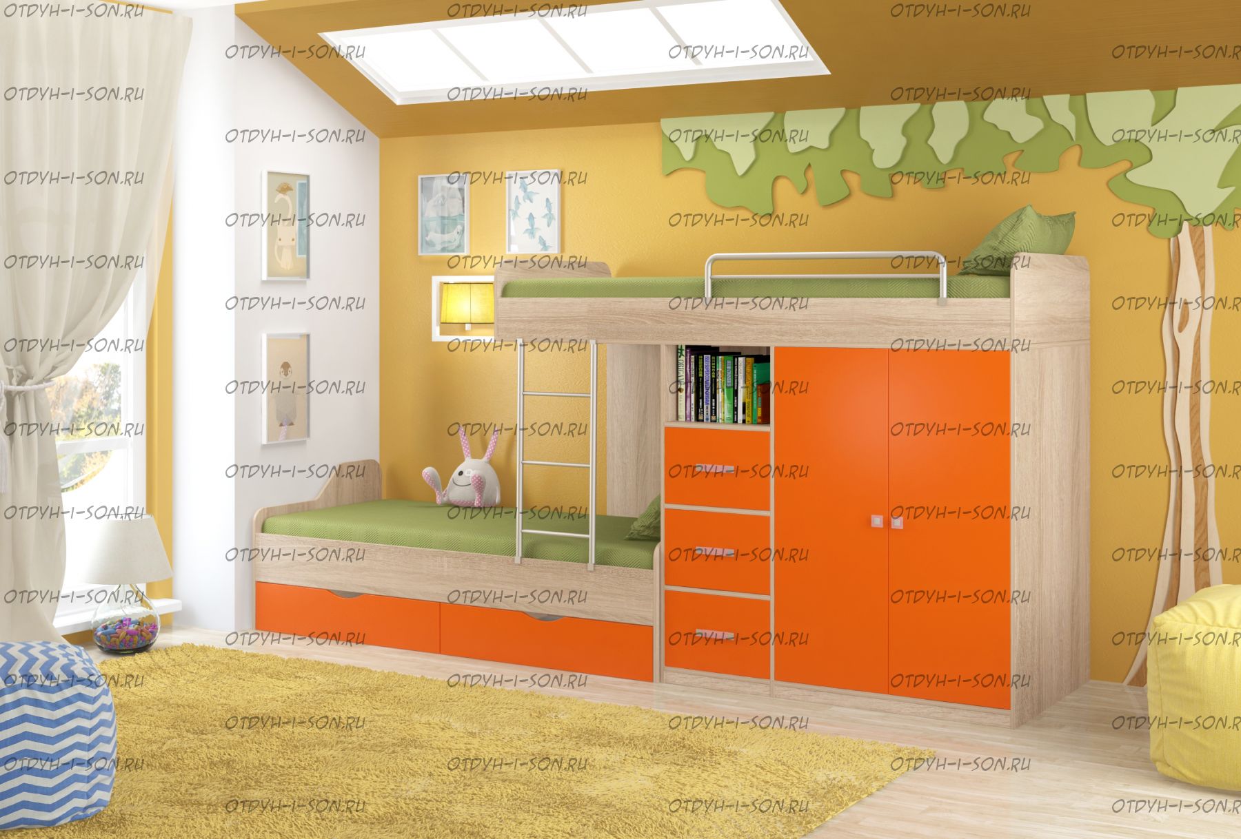 Кровать двухъярусная Дельта 18.04.02 Характеристики: Размер верхнего спального места: 80х200 см. Размер нижнего спального места: 80х190 см. Внешние габариты (ДхШхВ): 327х86х150 см. Материалы: ламинированная ДСП 16 мм. Кромка ПВХ толщиной 2 мм производства «Rehau» (Германия) Кровать поставляется в разобранном виде Вес: 179 кг, Объем: 0,38 м3. Максимальная нагрузка: Цвета корпуса: дуб молочный, дуб сонома, венге, орех Цвета фасадов: ольха, оранжевый, орех, дуб молочный, голубой, салатовый, крем ваниль, розовый, салатовый, венге, зеленый текстиль, желтый