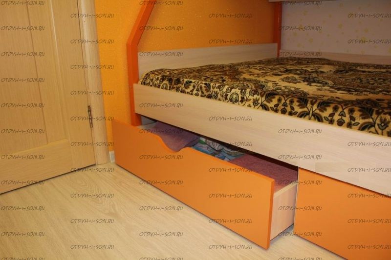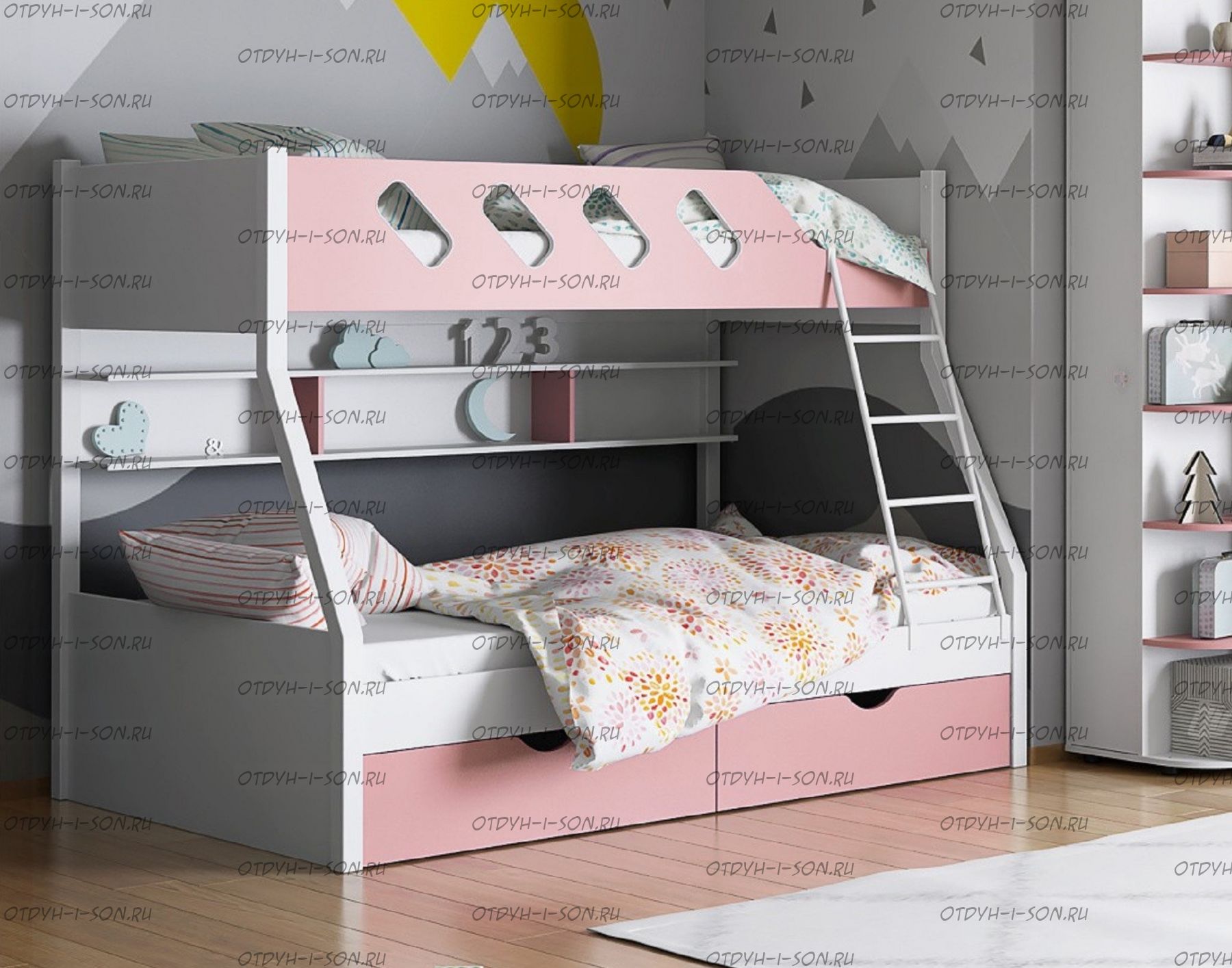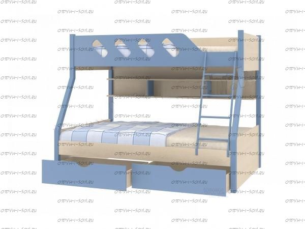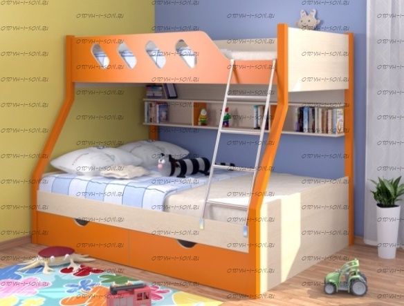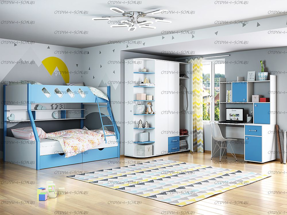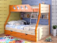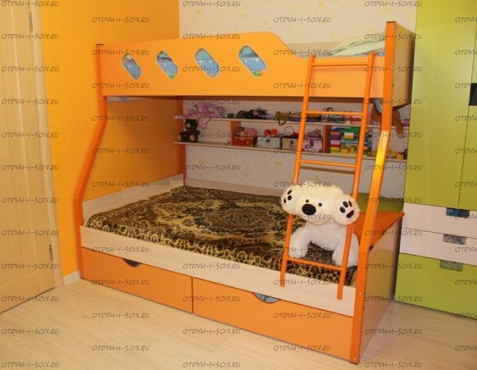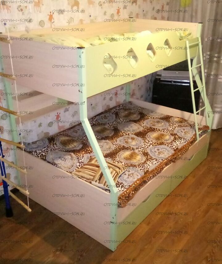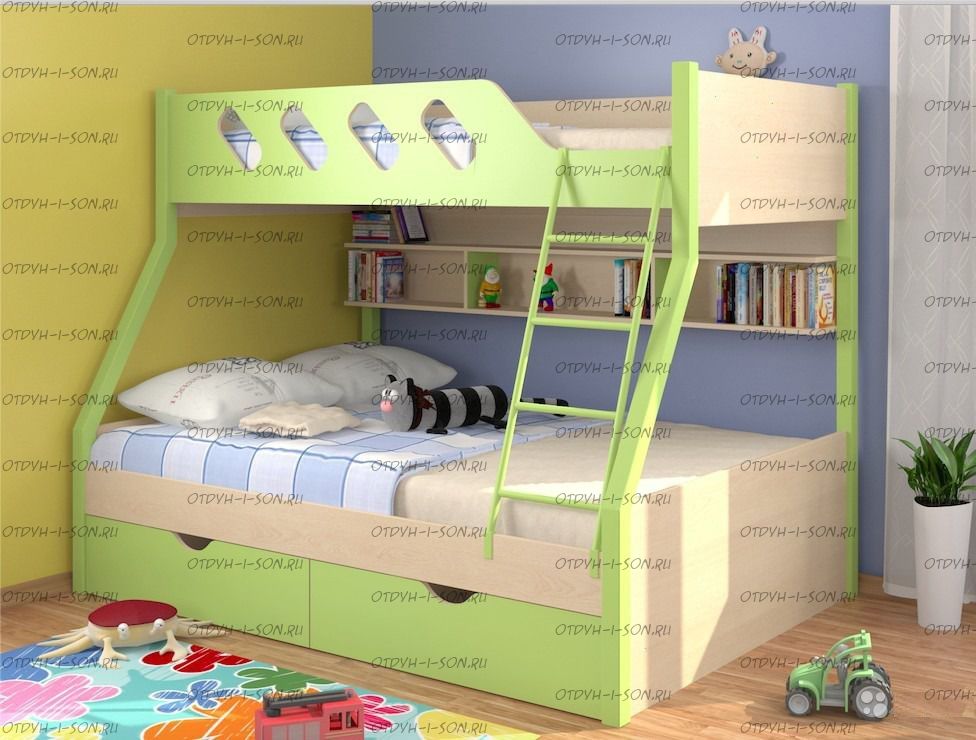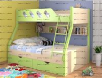 Кровать двухъярусная Дельта 20.02 Характеристики: Размер верхнего спального места: 90Х190см Размер нижнего спального места: 120х190 см Внешние габариты (ДхШхВ): 198х126х164 см. Материалы: ламинированная ДСП 16 мм. Материалы каркаса: металл Кромка ПВХ толщиной 2 мм производства «Rehau» (Германия) Кровать поставляется в разобранном виде Вес: 162 кг Объем: 0,6 м3 Максимальная нагрузка: 200 кг (верхний ярус до 70 кг.) Цвета корпуса: дуб молочный, дуб сонома, венге, орех Цвета фасадов: ольха, оранжевый, орех, дуб молочный, голубой, салатовый, крем ваниль, розовый, салатовый, венге, зеленый текстиль, желтый Цвет стоек стандарт: Голубой, Зеленый, Оранжевый, Цвет стоек под заказ: Слоновая кость, Серый, Коричневый, Черный