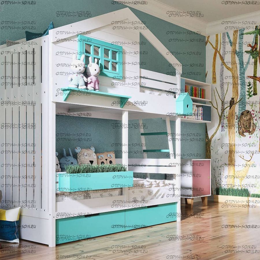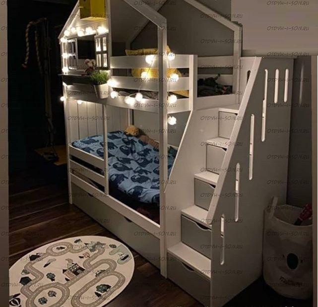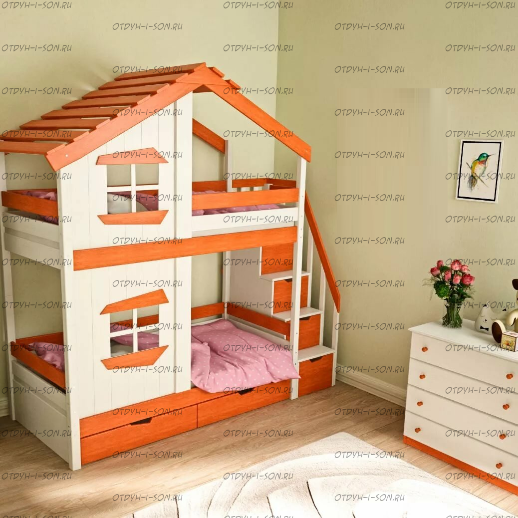 Кровать двухъярусная Домик Roof №3 Размеры лестницы Стандартная глубина лестницы к данной кровати: 90 см. При ширине спального места 70 см.: Возможно изготовление лестницы глубиной 80 см. Если это необходимо, обязательно указывайте этот размер при заказе. При ширине спального места 80 см.: стандартная глубина лестницы 90 см. При ширине спального места 90 см.: стандартная глубина лестницы 90 см. При ширине спального места 120 см.: стандартная глубина лестницы 90 см. Характеристики: Размер спального места: 80х160 + 80х160, 80х180 + 80х180, 80х190 + 80х190, 80х200 + 80х200, 90х160 + 90х160, 90х180 + 90х180, 90х190 + 90х190, 80х200 + 90х200 см. или любые другие на Ваш выбор. Общая высота: Высота царги: Характеристика выкатных ящиков: Комплект состоит из 2х ящиков; Мебельная фанера/ Массив дерева; Ящики на роликах; Дно ящика 5мм ДВП; Ящик двигается по полу. К кровати не фиксируется, установка с любой стороны. Масса в упаковке: Объем в упаковке: Материал: массив сосны Основание под матрас реечное Внимание: возможно увеличение высоты бортиков кровати! Цвет: орех, бук, венге, груша, дуб, каштан, клен, красное дерево, махагон, ольха, сосна, белый (эмаль), слоновая кость (эмаль)