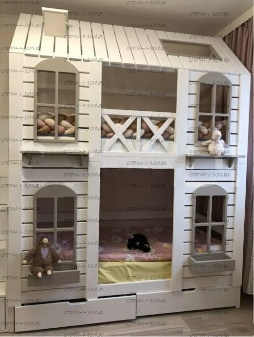 Двухъярусная кровать Домик Felicia №3С, крыша закрыта наполовину. В связи с широким выбором модификаций кровати Домик №7, при заказе необходимо указывать какая именно кровать, на какой фотографии, Вас интересует. Характеристики: Размер спального места: 70Х160+70Х160, 70Х170+70Х170, 70Х180+70Х180, 70Х190+70Х190, 80Х160+80Х160, 80Х170+80Х170, 80Х180+80Х180, 80Х190+80Х190, 90Х160+90Х160, 90Х170+90Х170, 90Х180+90Х180, 90Х190+90Х190 см., также возможно изготовление в других размерах. Материалы: Материалы: массив дерева Нестандарт: да, возможно, изготавливаем мебель по Вашим проектам Размер, цвет и декор также могут быть индивидуальны.