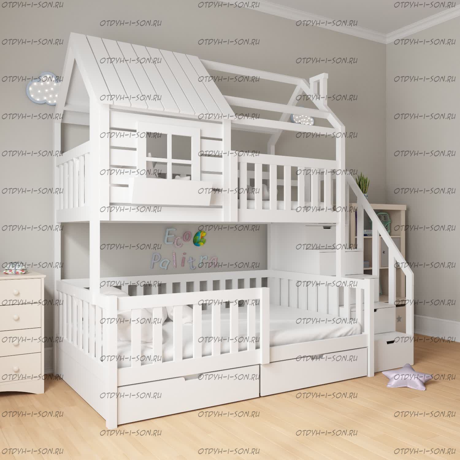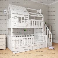 Кровать двухъярусная Домик Felicia №23+ может быть изготовлена как трехъярусная кровать, а также как кровать для новорожденного в любых размерах и цветах.