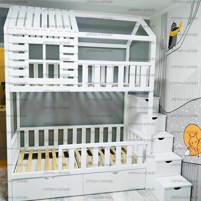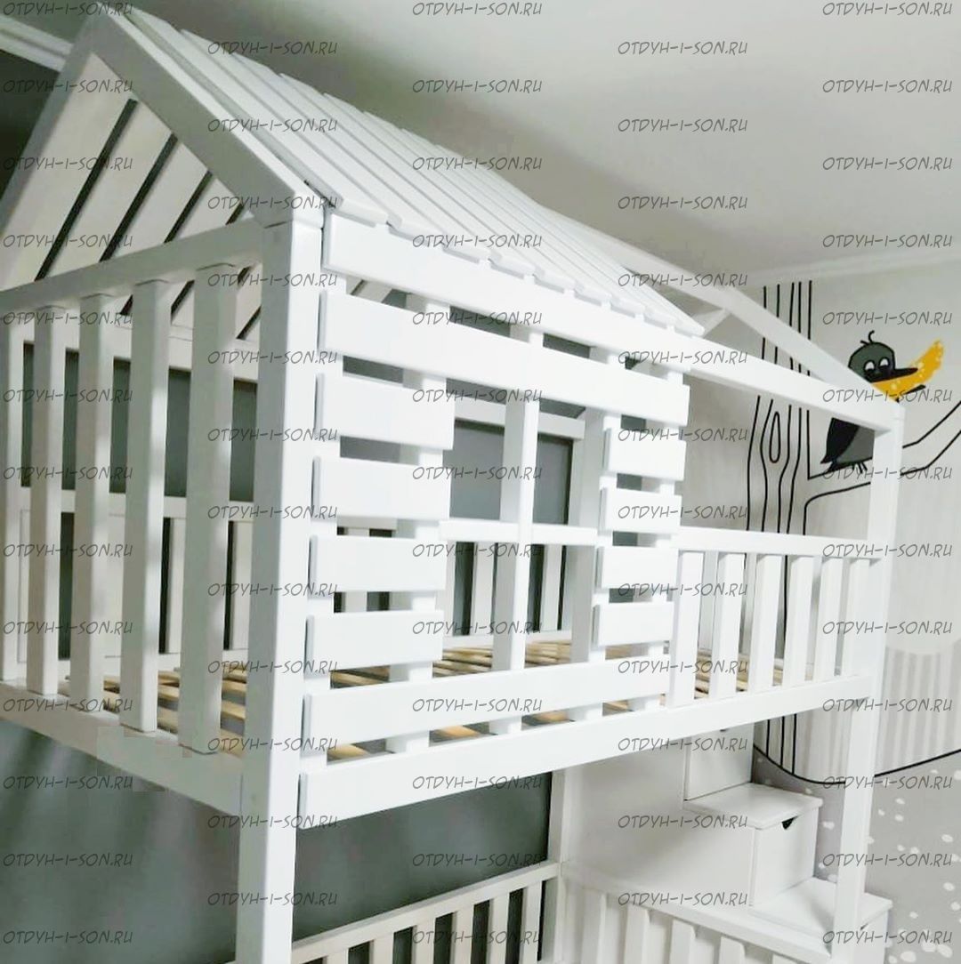 Кровать двухъярусная Домик Felicia №23 может быть изготовлена как трехъярусная кровать, а также как кровать для новорожденного в любых размерах и цветах.