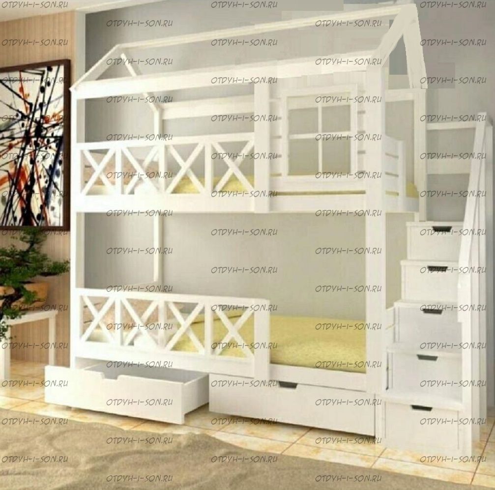 Кровать двухъярусная Домик Felicia №34 Комплектация: Кровать двухъярусная Домик Ящики подкроватные Лестница-тумба Характеристики: •Размеры верхнего спального места: 80х160 см.,90х180 см.,90х200 см.и любые другие •Размеры нижнего спального места: 80х160 см.,90х180 см.,90х200 см.и любые другие •Внешние размеры кровати при размере спального места 90х200 (ШхГхВ): 210х100х180 см. •Внешние размеры кровати с лестницей-комодом сп.место 90х200 (ШхГхВ): 260х100х180 см. •Габаритные размеры: любые •Материалы: массив сосны •Цвет покрытия: любая цветовая гамма (таблица палитры Ral);