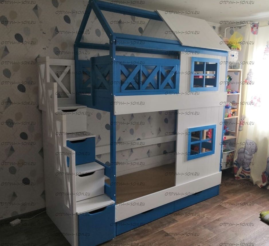 Кровать двухъярусная Домик Felicia №12А Комплектация: Кровать двухъярусная Домик Ящики подкроватные Лестница-тумба Характеристики: •Размеры верхнего спального места: 80х160 см.,90х180 см.,90х200 см.и любые другие •Размеры нижнего спального места: 80х160 см.,90х180 см.,90х200 см.и любые другие •Внешние размеры кровати при размере спального места 90х200 (ШхГхВ): •Внешние размеры кровати с лестницей-комодом сп.место 90х200 (ШхГхВ): •Габаритные размеры: любые •Материалы: массив сосны •Цвет покрытия: любая цветовая гамма (таблица палитры Ral);
