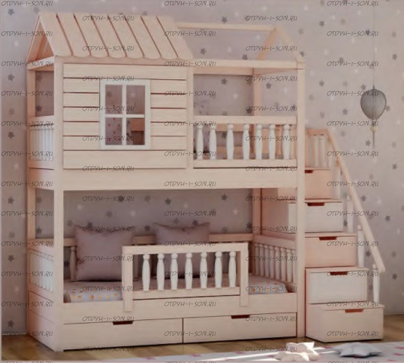 Кровать двухъярусная Домик Felicia №8, есть любые размеры Комплектация: Кровать двухъярусная Домик Ящики подкроватные Лестница-тумба Характеристики: •Размеры верхнего спального места: 80х160 см.,90х180 см.,90х200 см.и любые другие •Размеры нижнего спального места: 80х160 см.,90х180 см.,90х200 см.и любые другие •Внешние размеры кровати при размере спального места 90х200 (ШхГхВ): •Внешние размеры кровати с лестницей-комодом сп.место 90х200 (ШхГхВ): •Габаритные размеры: любые •Материалы: массив сосны •Цвет покрытия: любая цветовая гамма (таблица палитры Ral);