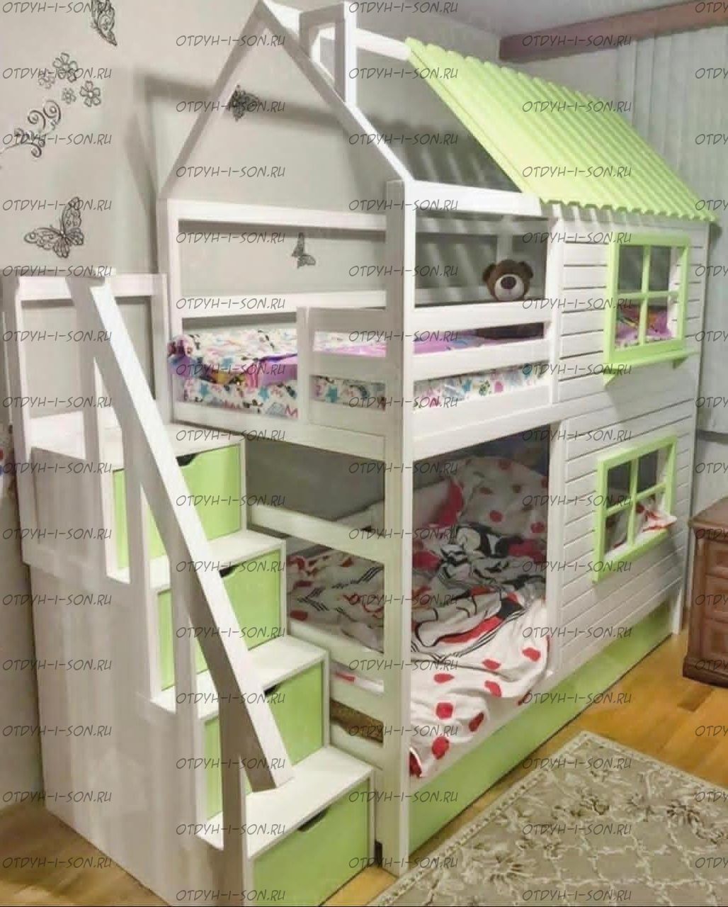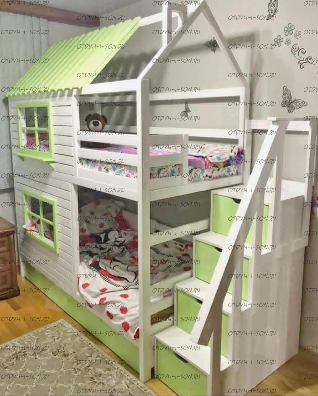Кровать двухъярусная Домик Felicia №20 Комплектация: Кровать двухъярусная Домик Ящики подкроватные Лестница-тумба Характеристики: •Размеры верхнего спального места: 80х160 см.,90х180 см.,90х200 см.и любые другие •Размеры нижнего спального места: 80х160 см.,90х180 см.,90х200 см.и любые другие •Внешние размеры кровати при размере спального места 90х200 (ШхГхВ): •Внешние размеры кровати с лестницей-комодом сп.место 90х200 (ШхГхВ): •Габаритные размеры: любые •Материалы: массив сосны •Цвет покрытия: любая цветовая гамма (таблица палитры Ral);
