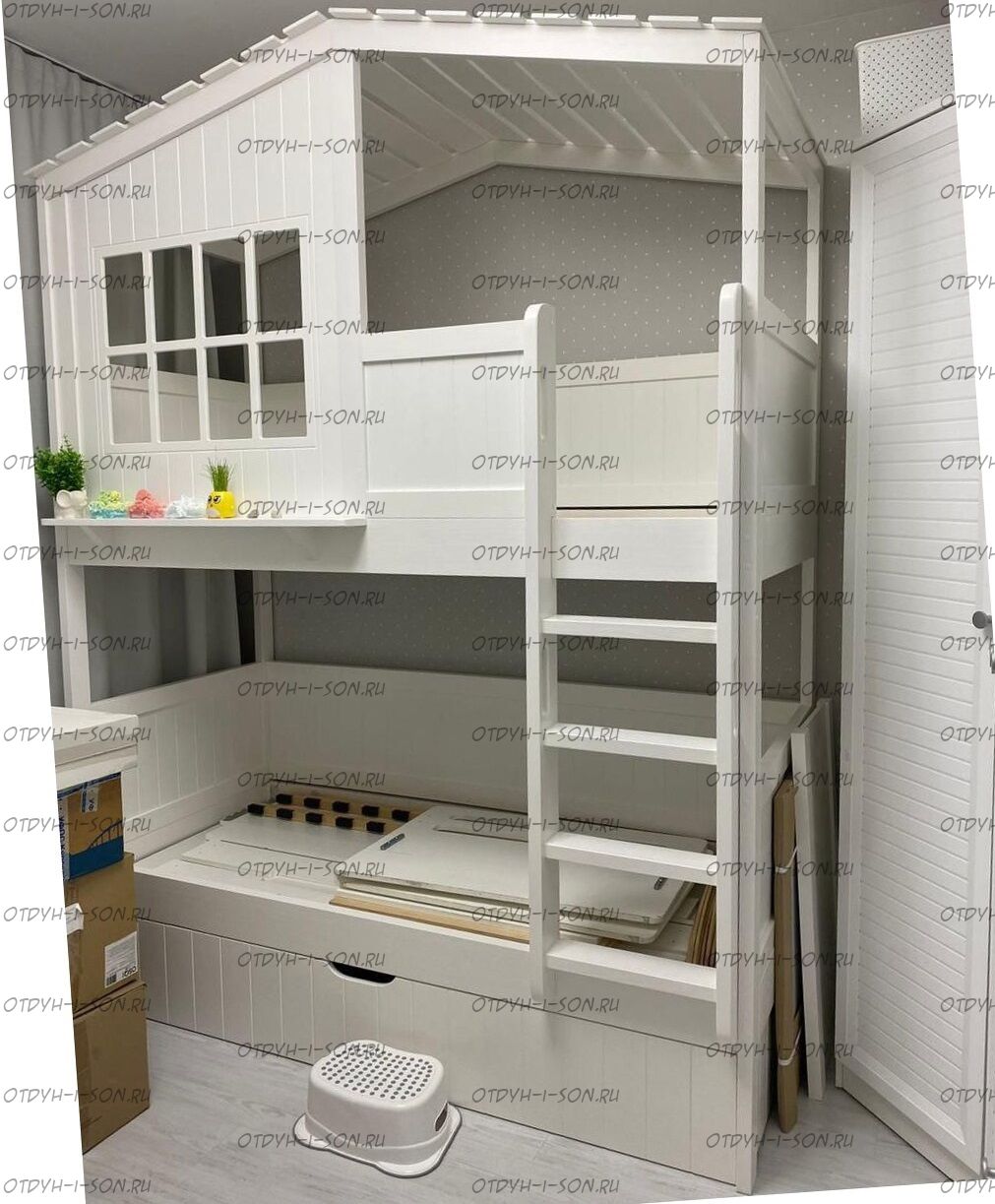 Кровать двухъярусная Домик Roof №7 Комплектация: Кровать двухъярусная Домик Ящики подкроватные Лестница Крыша кровати открытая Характеристики: •Размеры верхнего спального места: 80х160 см.,90х180 см.,90х200 см.и любые другие •Размеры нижнего спального места: 80х160 см.,90х180 см.,90х200 см.и любые другие •Внешние размеры кровати при размере спального места 90х200 (ШхГхВ): 210х100х180 см. •Внешние размеры кровати с лестницей-комодом сп.место 90х200 (ШхГхВ): 260х100х180 см. •Габаритные размеры: любые •Материалы: массив сосны •Цвет покрытия: любая цветовая гамма (таблица палитры Ral);