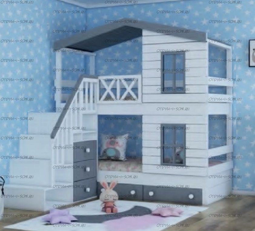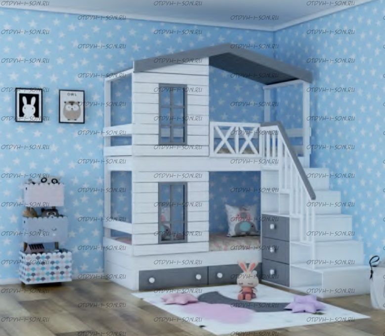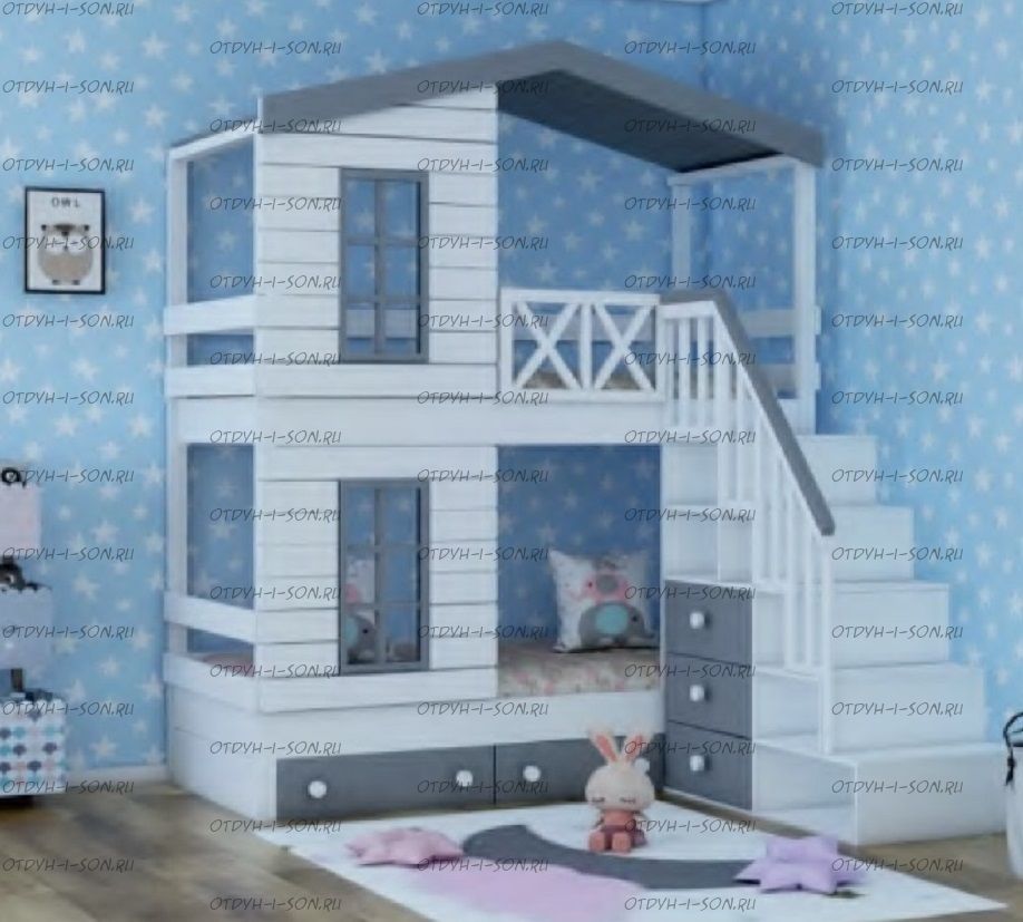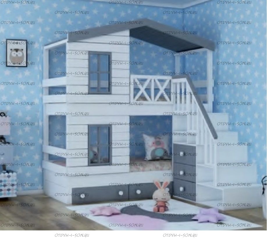 Кровать двухъярусная Домик Roof №17 Комплектация: Кровать двухъярусная Домик Ящики подкроватные Лестница-тумба Характеристики: •Размеры верхнего спального места: 80х160 см.,90х180 см.,90х200 см.и любые другие •Размеры нижнего спального места: 80х160 см.,90х180 см.,90х200 см.и любые другие •Внешние размеры кровати при размере спального места 90х200 (ШхГхВ): •Внешние размеры кровати с лестницей-комодом сп.место 90х200 (ШхГхВ): •Габаритные размеры: любые •Материалы: массив сосны •Цвет покрытия: любая цветовая гамма (таблица палитры Ral);