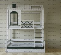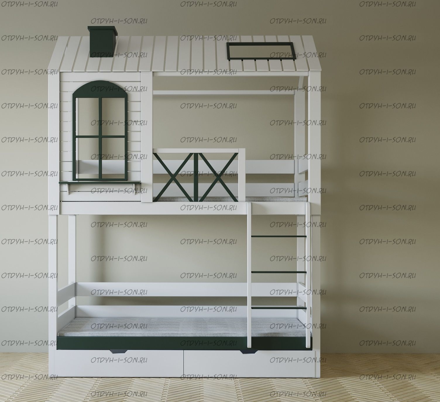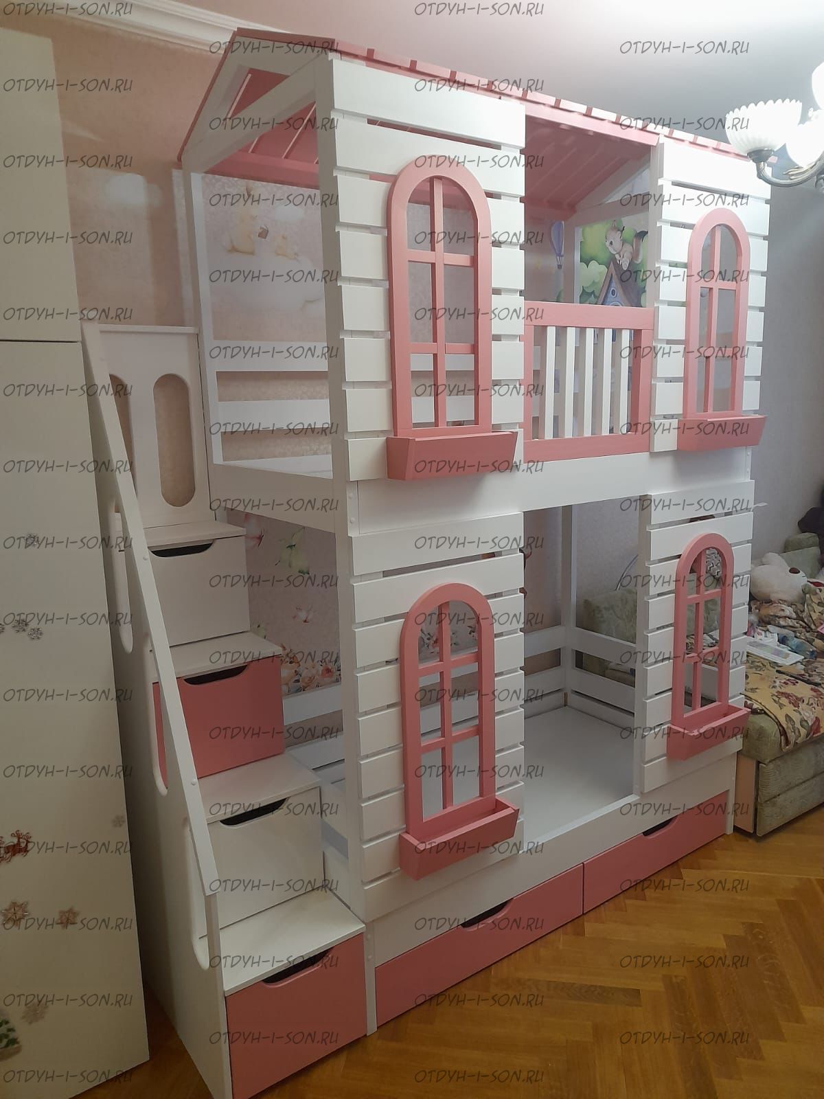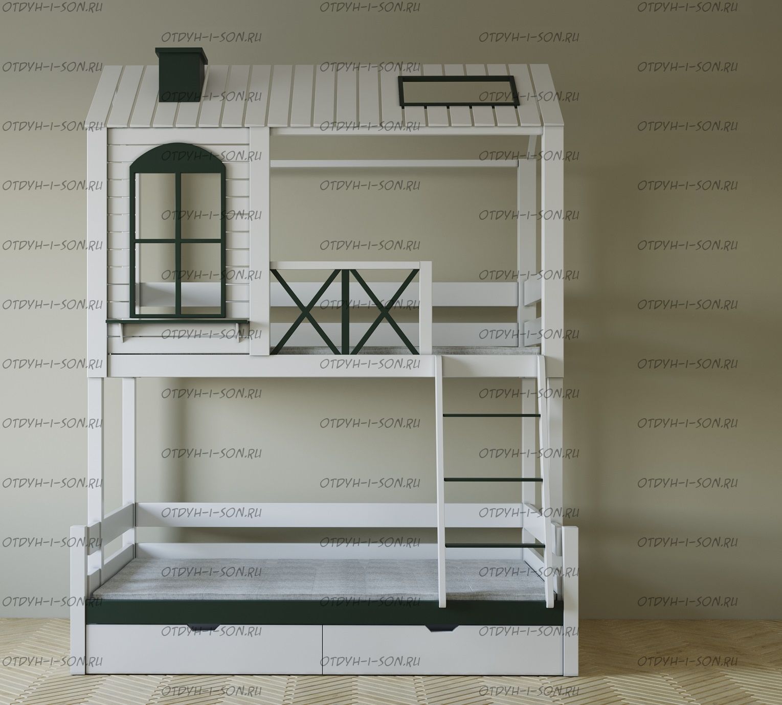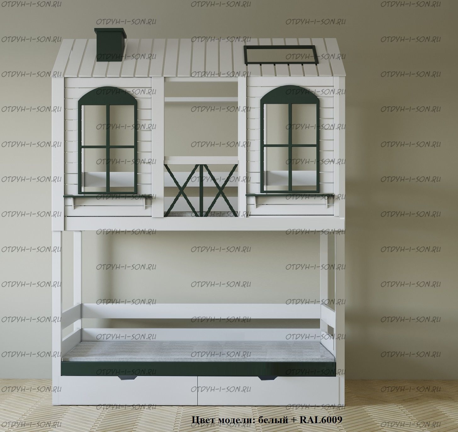 Кровать двухъярусная Домик Felicia №3D Комплектация: Кровать двухъярусная Домик Ящики подкроватные Характеристики: •Размеры верхнего спального места: 80х160 см.,90х180 см.,90х200 см.и любые другие •Размеры нижнего спального места: 80х160 см.,90х180 см.,90х200 см.и любые другие •Внешние размеры кровати при размере спального места 90х200 (ШхГхВ): •Внешние размеры кровати с лестницей-комодом сп.место 90х200 (ШхГхВ): •Габаритные размеры: любые •Материалы: массив сосны •Цвет покрытия: любая цветовая гамма (таблица палитры Ral);