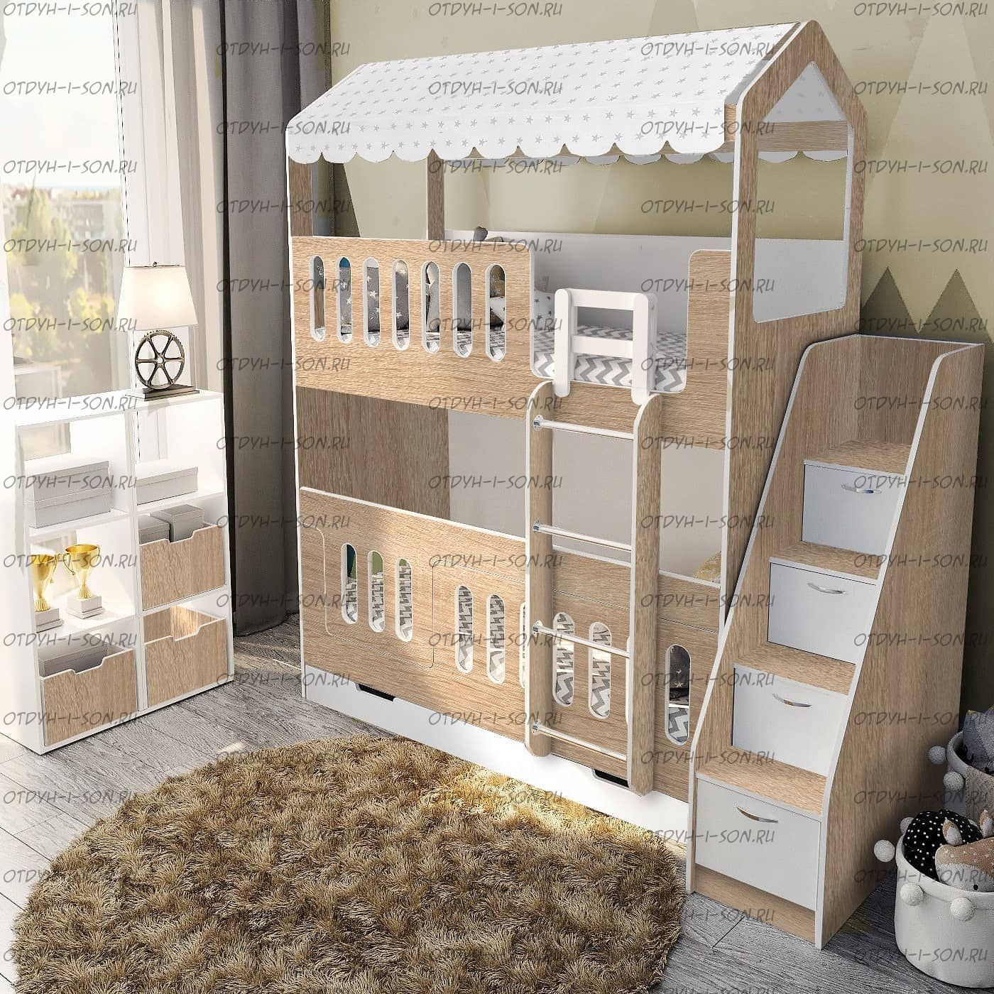 Кровать двухъярусная Домик с лестницей ДС-30, большой выбор цветов