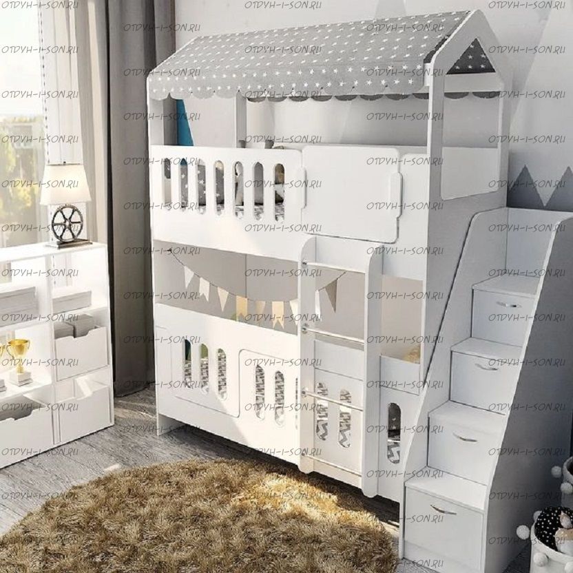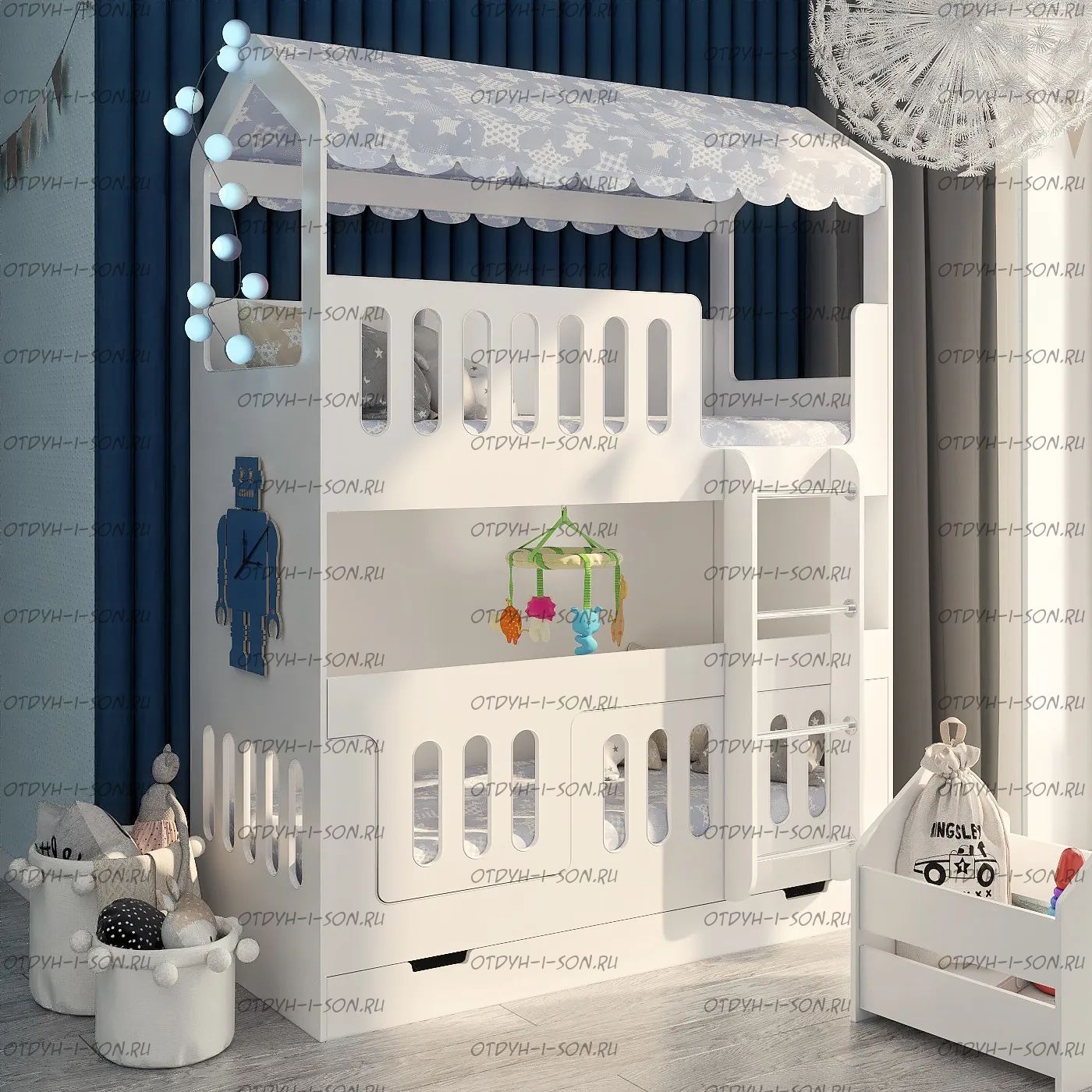 Кровать двухъярусная Домик с лестницей ДС-30, большой выбор цветов Комплектация: Кровать двухъярусная Домик ДС-30 Лестница-комод 13/8 Характеристики: Размер спальных мест: 80х160 + 80х160 см. или 80х180 + 80х180 см. Внешние габариты без лестницы, спальное место 80х160: Длина 163,2 х Ширина 83,2 х Высота 260 см. Внешние габариты без лестницы, спальное место 80х180: Длина 183,2 х Ширина 83,2 х Высота 260 см. Лестница-комод: Высота 150 х Ширина 40 х Глубина 100 см.