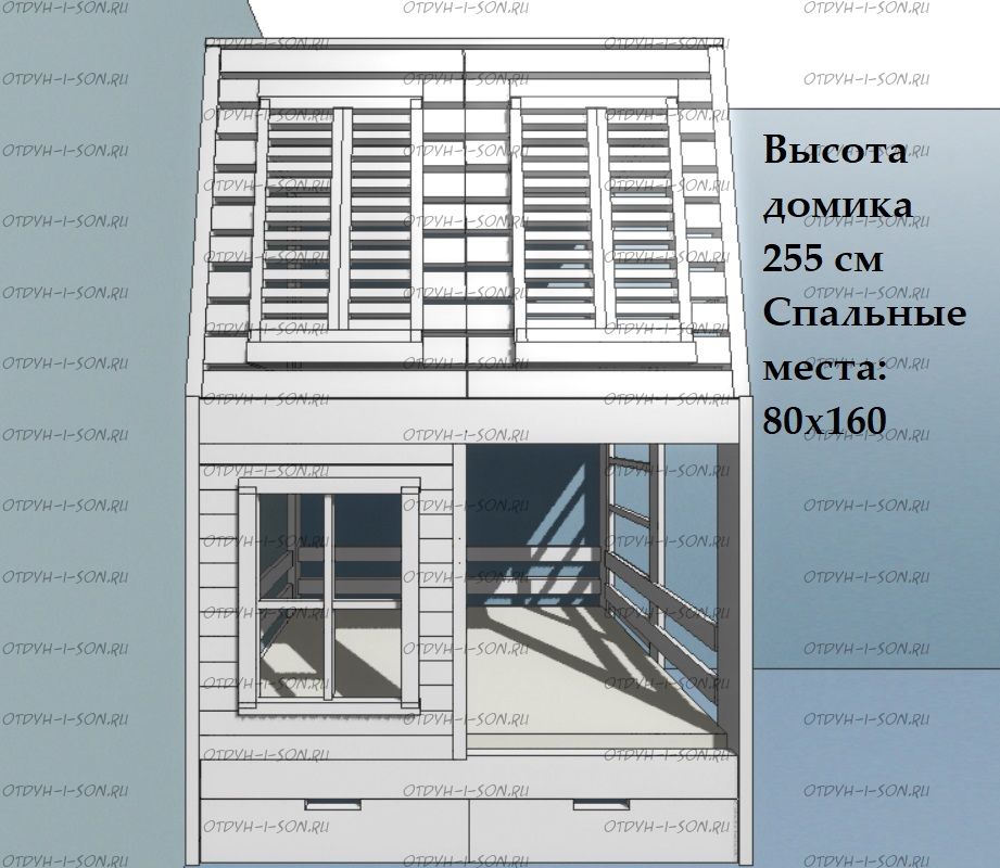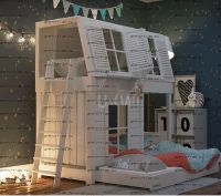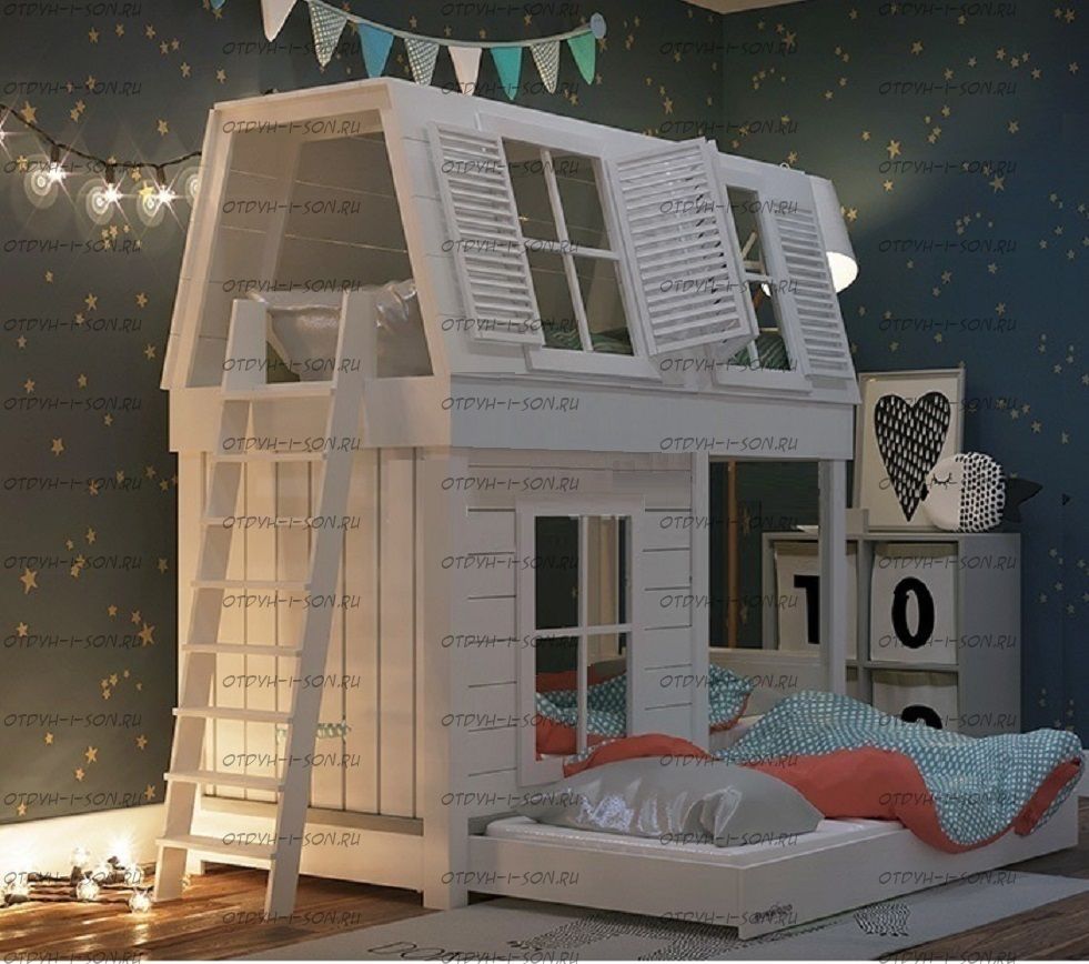 Кровать двухъярусная Домик Village с крышей №5Д Характеристики: Размер спальных мест: 80Х160 + 80Х160, 80Х170 + 80Х170, 80Х190 + 80Х190, 90Х160 + 90Х160, 90Х180 + 90Х180, 90Х190 + 90Х190 см. и любые другие на Ваш выбор. Внешние габариты кровати: +10см к ширине, +10см к длине Материалы: массив натурального дерева Устойчивая, надежная конструкция Покрытие: натуральные, сертифицированные краски на водной основе, пригодные для контакта с детьми