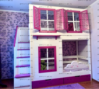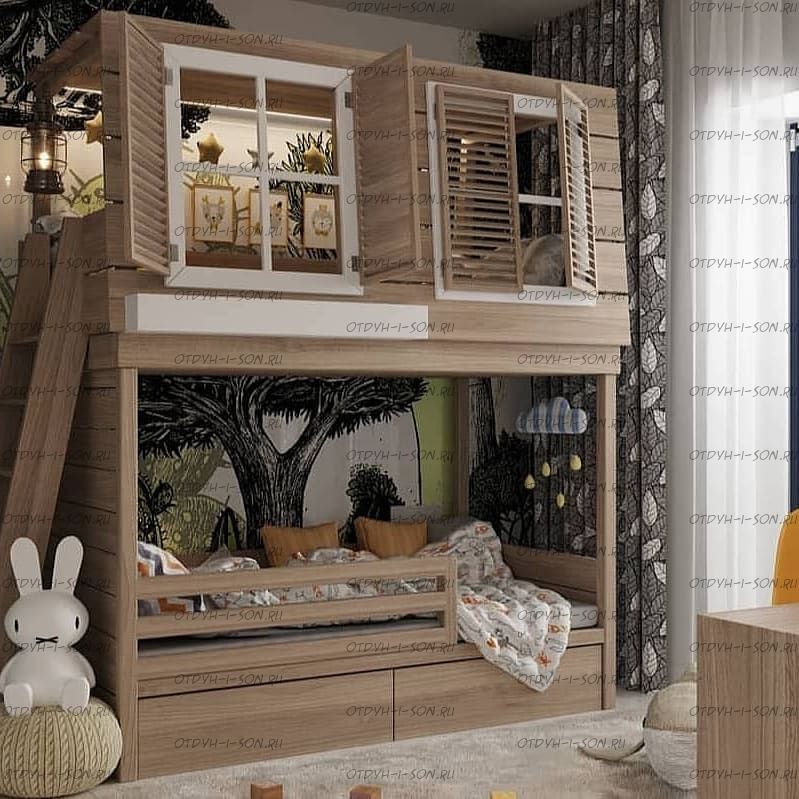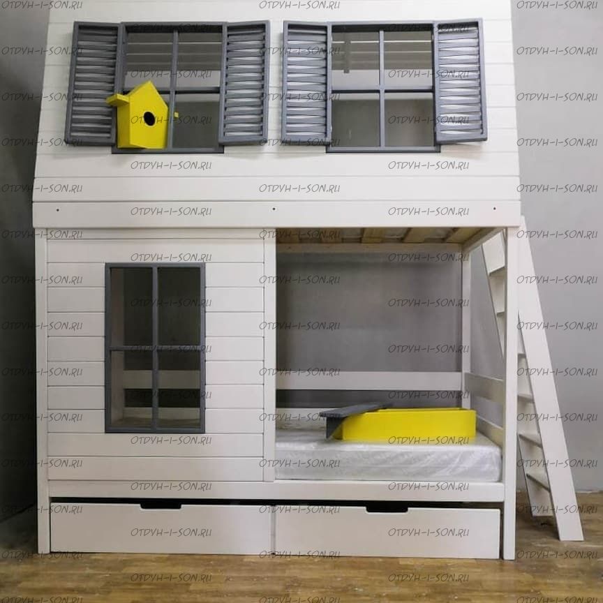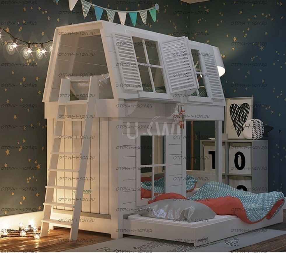 Кровать двухъярусная Домик Village с крышей №5Д Характеристики: Размер спальных мест: 80Х160 + 80Х160, 80Х170 + 80Х170, 80Х190 + 80Х190, 90Х160 + 90Х160, 90Х180 + 90Х180, 90Х190 + 90Х190 см. и любые другие на Ваш выбор. Внешние габариты кровати: +10см к ширине, +10см к длине Материалы: массив натурального дерева Устойчивая, надежная конструкция Покрытие: натуральные, сертифицированные краски на водной основе, пригодные для контакта с детьми