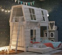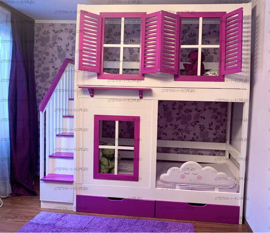 Кровать двухъярусная Домик Village №3, любые размеры и цвета Характеристики: Размер спальных мест: 80Х160 + 80Х160, 80Х170 + 80Х170, 80Х190 + 80Х190, 90Х160 + 90Х160, 90Х180 + 90Х180, 90Х190 + 90Х190 см. и любые другие на Ваш выбор. Внешние габариты кровати: Материалы: массив натурального дерева Устойчивая, надежная двухъярусная конструкция Покрытие: натуральные, сертифицированные краски на водной основе, пригодные для контакта с детьми Высота первого яруса 125 см Высота второго яруса 100 см Выдвижное спальное место, соответствующего размеры спального места Возможно написать имя ребенка на корпусе кровати