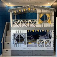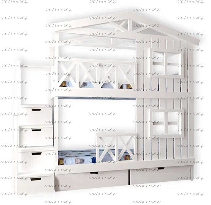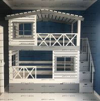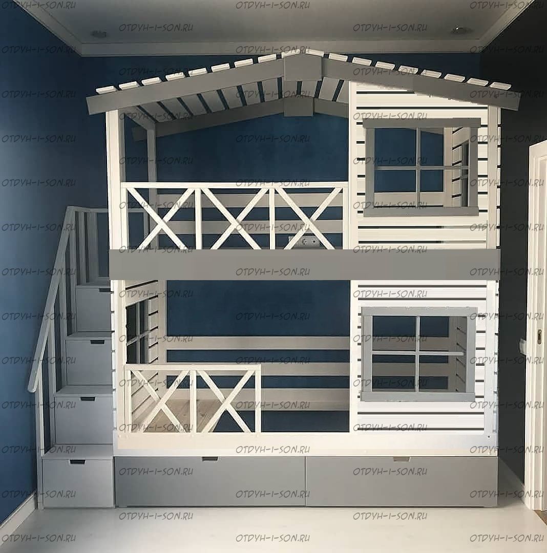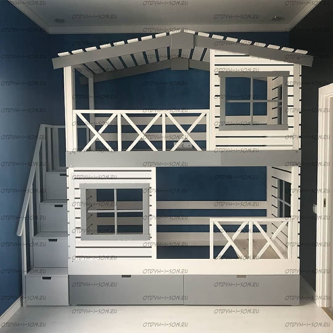 Кровать двухъярусная Домик Roof №20Y с четырьмя окнами может быть изготовлена как трехъярусная кровать.