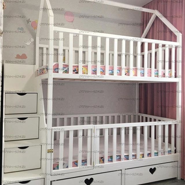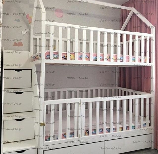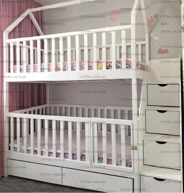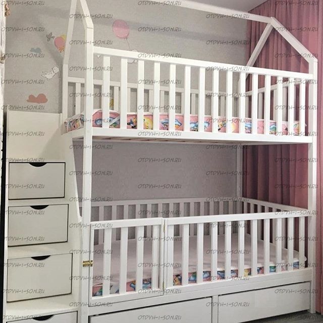 Кровать двухъярусная Домик Малинка Standard №26 может быть изготовлена с кроватью для новорожденного внизу или как трехъярусная кровать, а также в любых размерах и цветах. Характеристики: Размер спального места верхнего яруса: 70х180, 80х180 см, 80х190 см, 90х190 см., 90х200 см. (и любые другие на Ваш вкус) Размер спального места нижнего яруса: 80х190, 80х200, 90х190, 90х200, 120х190, 120х200, 130х200, 140х190 см. (и любые другие на Ваш вкус) Возможны нестандартные размеры Внешние габариты (ДхШхВ): +55 см. к длине сп. места, +10 см. ширине сп. места, высота: уточняется Материал: сосна Высота бортика нижнего яруса кровати от пола: 90 см. Высота до начала нижней царги (боковины): 19 см. Матрас первого яруса кладется на уровне 26,5 см. от пола Высота от пола до верхней царги: 140 см. Матрас первого яруса кладется на уровне 146,5 см. от пола Высота полностью всей кровати от пола примерно 200-205 см. (Данные размеры можно немного менять вверх и вниз). Ящики на колесиках , их можно полностью выдвигать и мыть полы Материал: сосна Возможны любые нестандартные размеры Вес кровати: Объем кровати: Цвет: любой Возможность трансформации в отдельно стоящие кровать чердак и двуспальную кровать; - без матрасов; опорный брус спинок(ножки) - 40х80мм. Внимание: для любой модели кровати возможно увеличение высоты бортиков кровати! Возможно изготовление кровати нестандартных размеров по вашим замерам, доплата за нестандартный размер: - за кровать + 10% от стоимости изделия; Производство Владимирской мебельной фабрики, кровать доставляется напрямую от производителя, самовывоз ограничен.