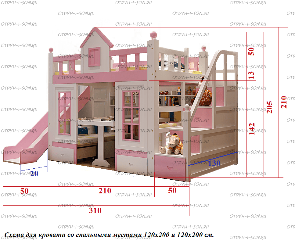 Кровать двухъярусная Принцесса №IR18 Комплектация: Кровать чердак Домик Горка докупается отдельно Характеристики: Размер спальных мест: 80Х160 + 80Х160, 80Х170 + 80Х170, 80Х190 + 80Х190, 90Х160 + 90Х160, 90Х180 + 90Х180, 90Х190 + 90Х190 см. и любые другие на Ваш выбор. Внешние габариты кровати: Материалы: массив натурального дерева Устойчивая, надежная двухъярусная конструкция Покрытие: натуральные, сертифицированные краски на водной основе, пригодные для контакта с детьми Выдвижное спальное место, соответствующего размеры спального места Возможно написать имя ребенка на корпусе кровати