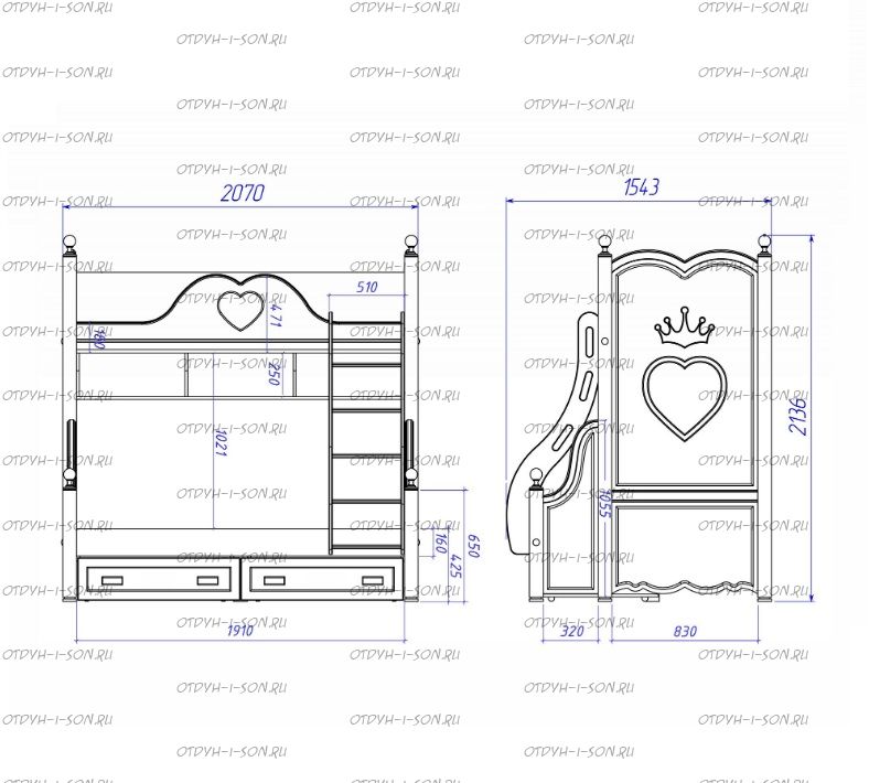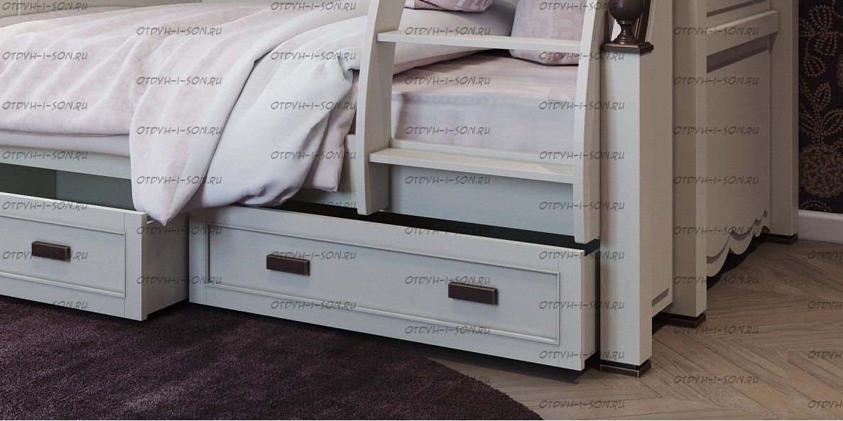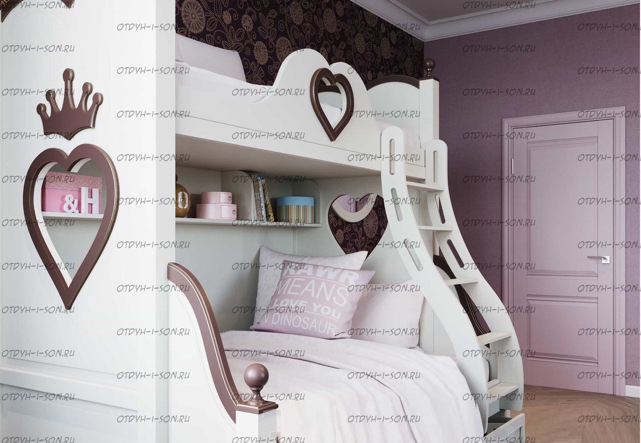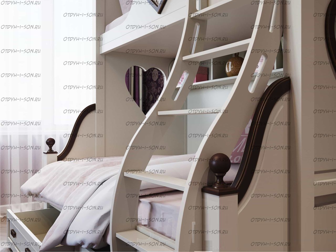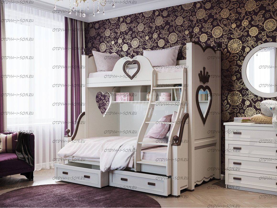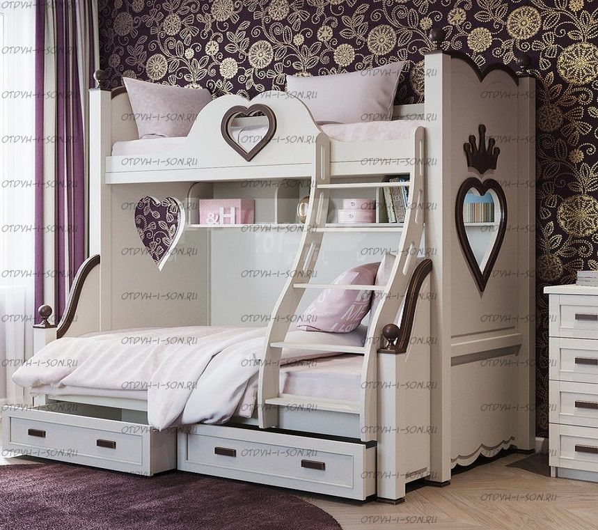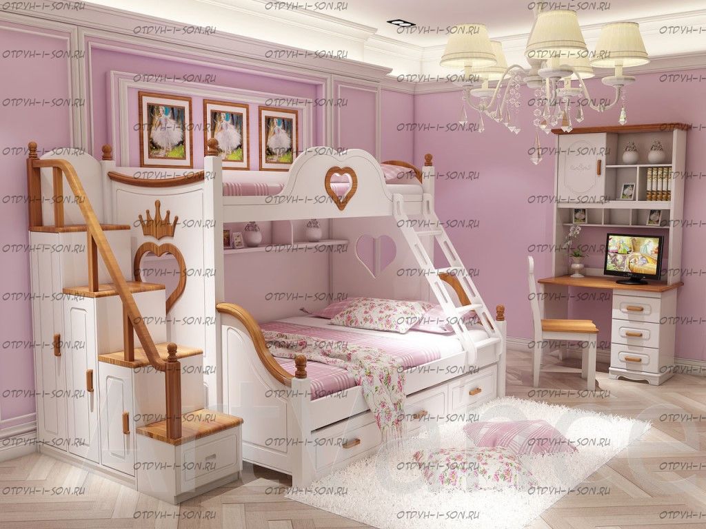 Кровать двухъярусная Принцесса №K07 Характеристики: Размер спальных мест:90х190 + 120х190 см. Габариты (ШхДхВ): 1543х2070х2136 см. также есть любые другие на Ваш выбор. Максимальнаяна грузка: 150 кг. Материалы: массив натурального дерева Устойчивая, надежная двухъярусная конструкция Покрытие: натуральные, сертифицированные краски на водной основе, пригодные для контакта с детьми Выдвижное спальное место, соответствующего размеры спального места Возможно написать имя ребенка на корпусе кровати