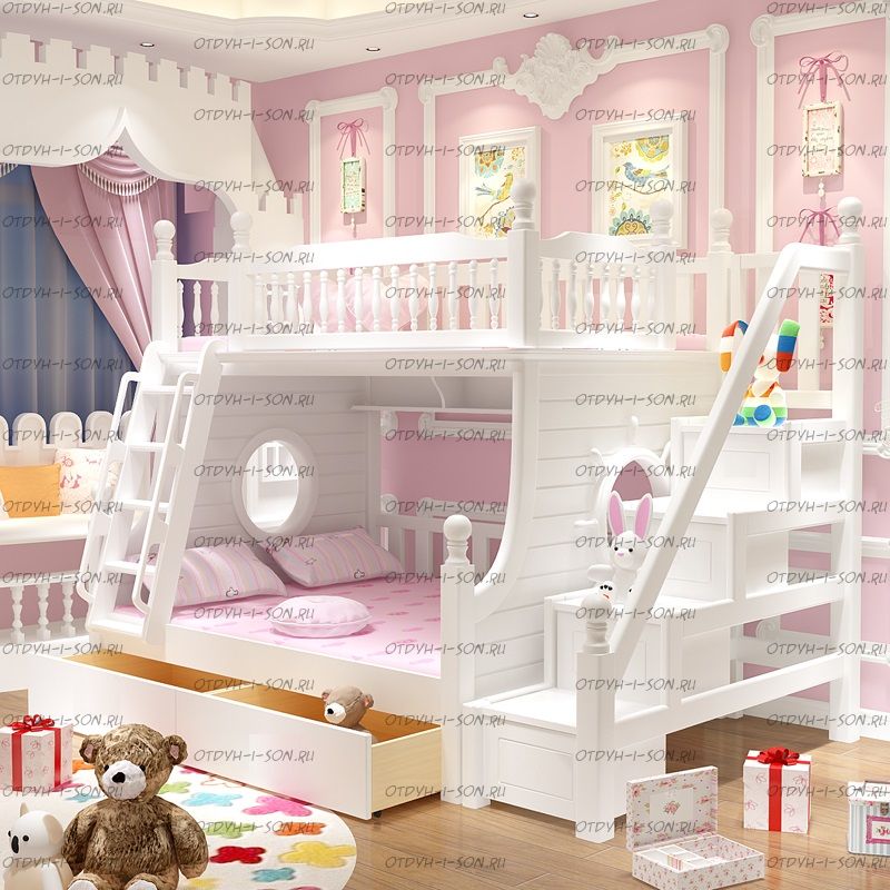 Кровать двухъярусная домик Принцесса Fantasy №IR02 Характеристики: Размер спальных мест: 80Х160 + 90Х160, 80Х170 + 90Х170, 80Х190 + 90Х190, 90Х160 + 100Х160, 90Х180 + 100Х180, 90Х190 + 100Х190 см. и любые другие на Ваш выбор. Внешние габариты кровати: Материалы: массив натурального дерева Устойчивая, надежная двухъярусная конструкция Покрытие: натуральные, сертифицированные краски на водной основе, пригодные для контакта с детьми Выдвижное спальное место, соответствующего размеры спального места Возможно написать имя ребенка на корпусе кровати