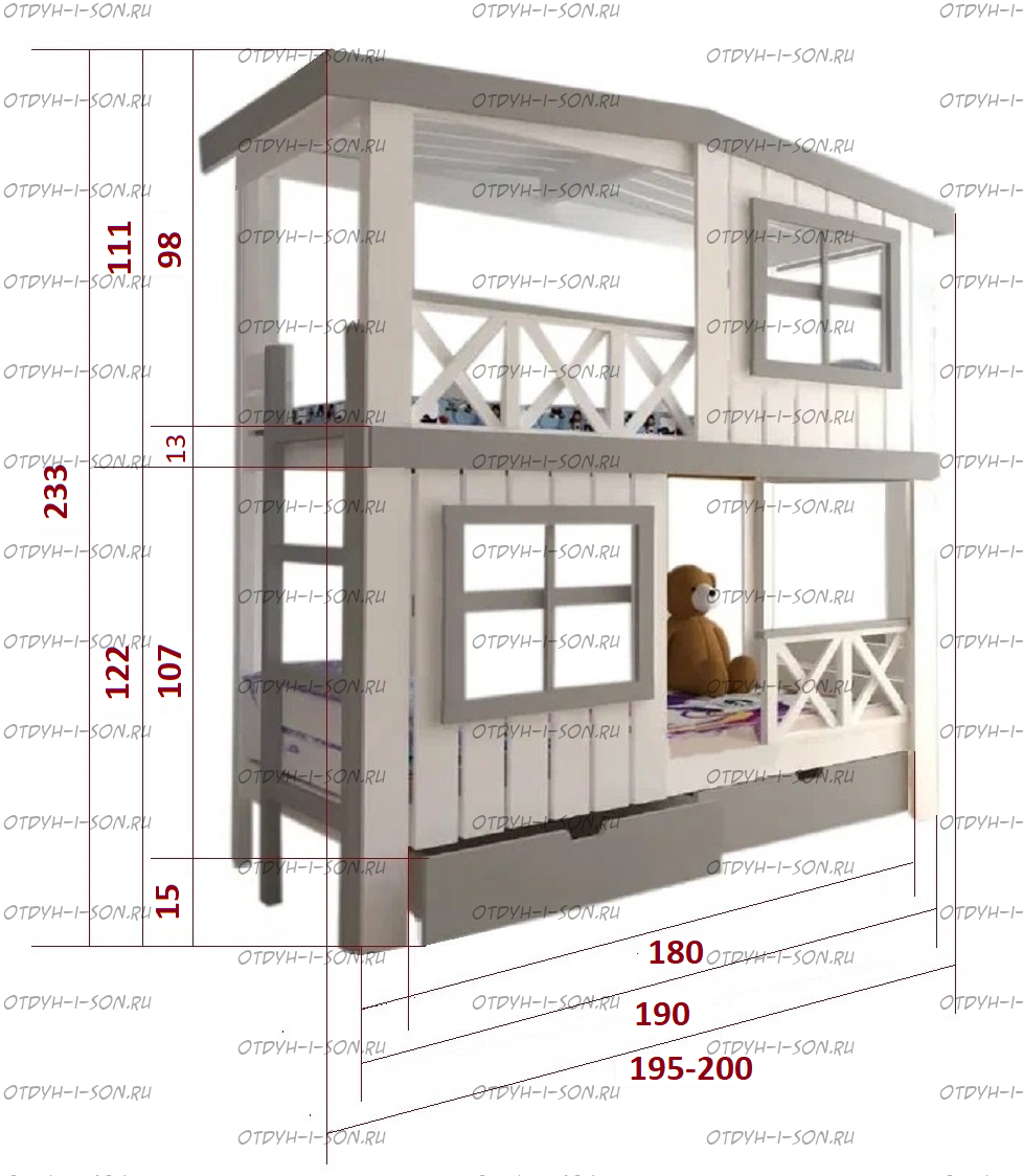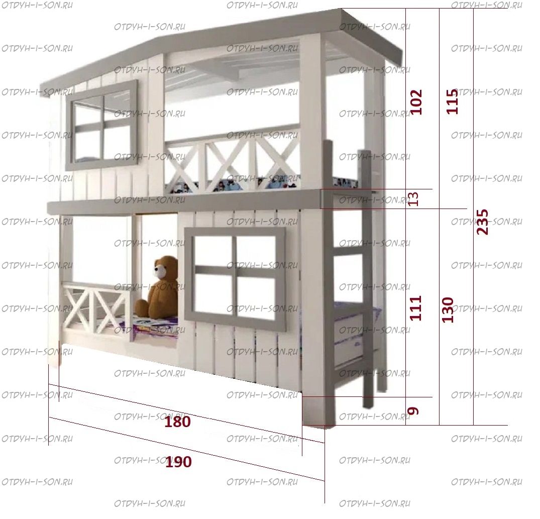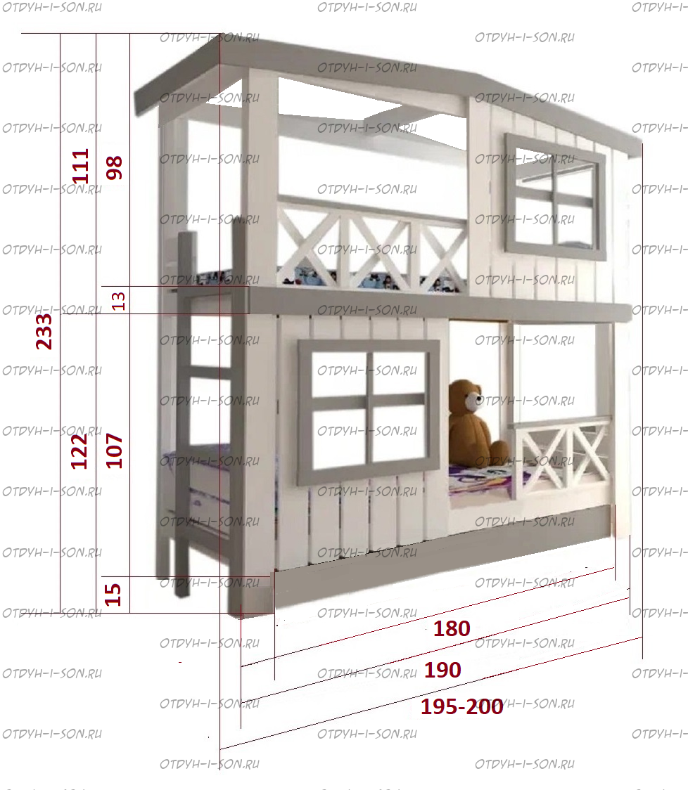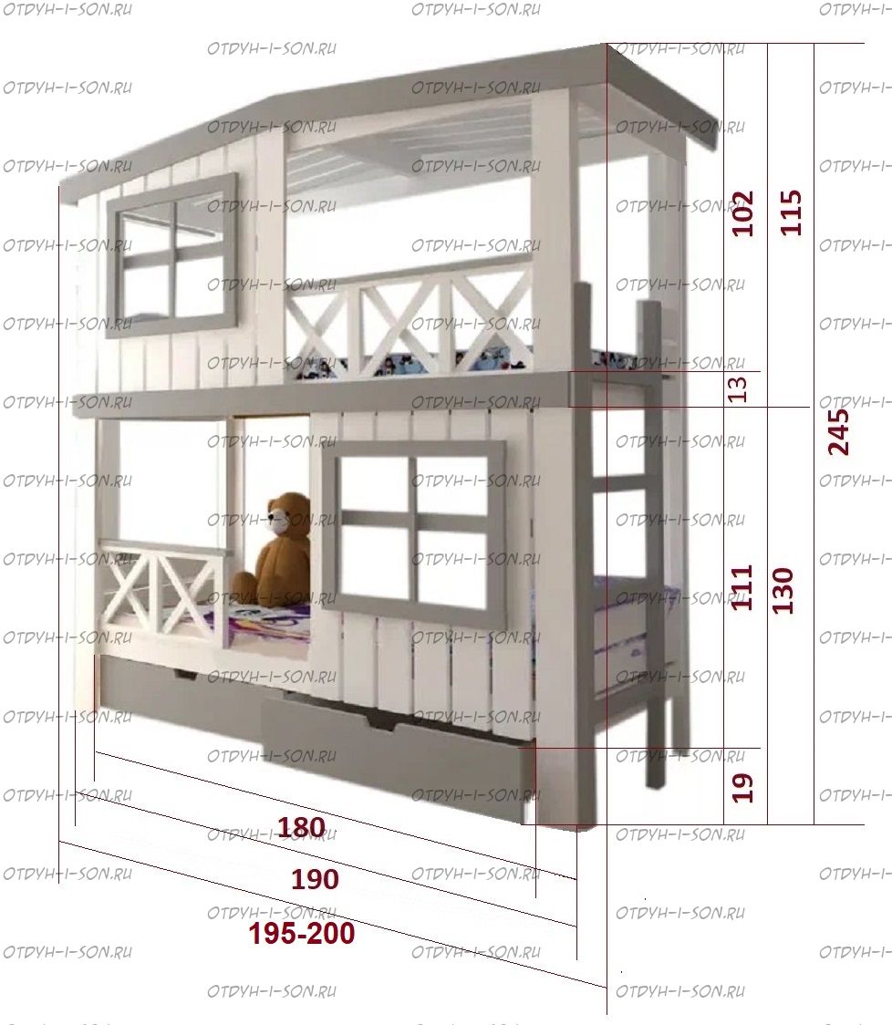 Кровать двухъярусная Домик Roof №20Z с двумя окнами может быть изготовлена как трехъярусная кровать. Характеристики: Размер спального места верхнего яруса: 70х180, 80х180 см, 80х190 см, 90х190 см., 90х200 см. (и любые другие на Ваш вкус) Размер спального места нижнего яруса: 80х190, 80х200, 90х190, 90х200, 120х190, 120х200, 130х200, 140х190 см. (и любые другие на Ваш вкус) Внешние размеры: Материал: сосна Возможны любые нестандартные размеры Вес кровати: Объем кровати: Цвет: Возможность трансформации в отдельно стоящие кровать чердак и двуспальную кровать; - без матрасов; опорный брус спинок(ножки) - 40х80мм. Внимание: для любой модели кровати возможно увеличение высоты бортиков кровати! Возможно изготовление кровати нестандартных размеров по вашим замерам, доплата за нестандартный размер: - за кровать + 10% от стоимости изделия; Производство Владимирской мебельной фабрики, кровать доставляется напрямую от производителя, самовывоз ограничен.