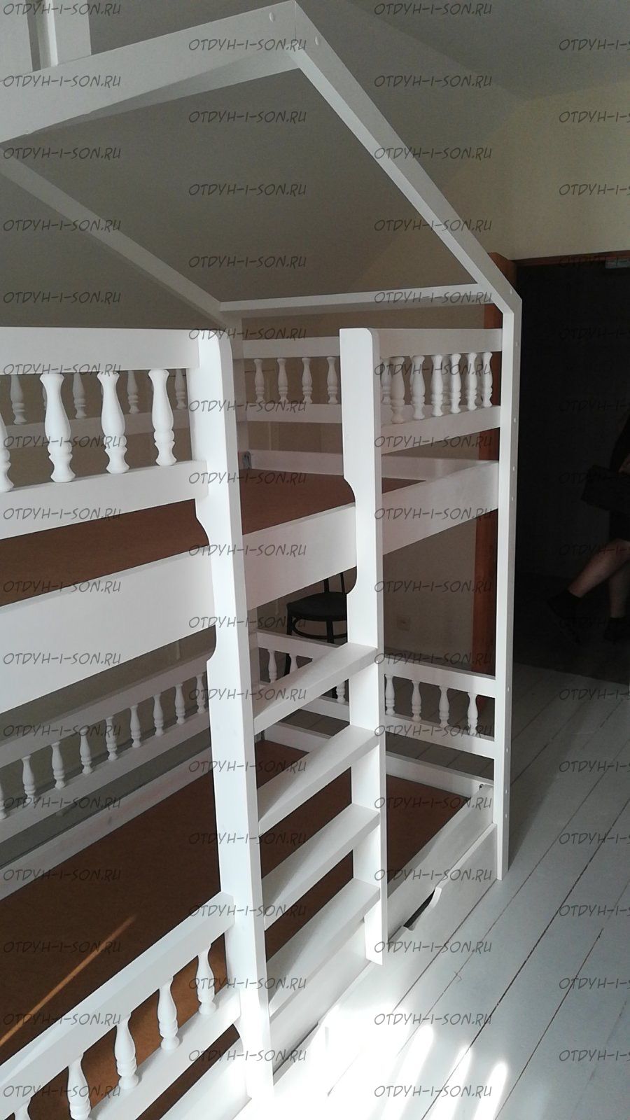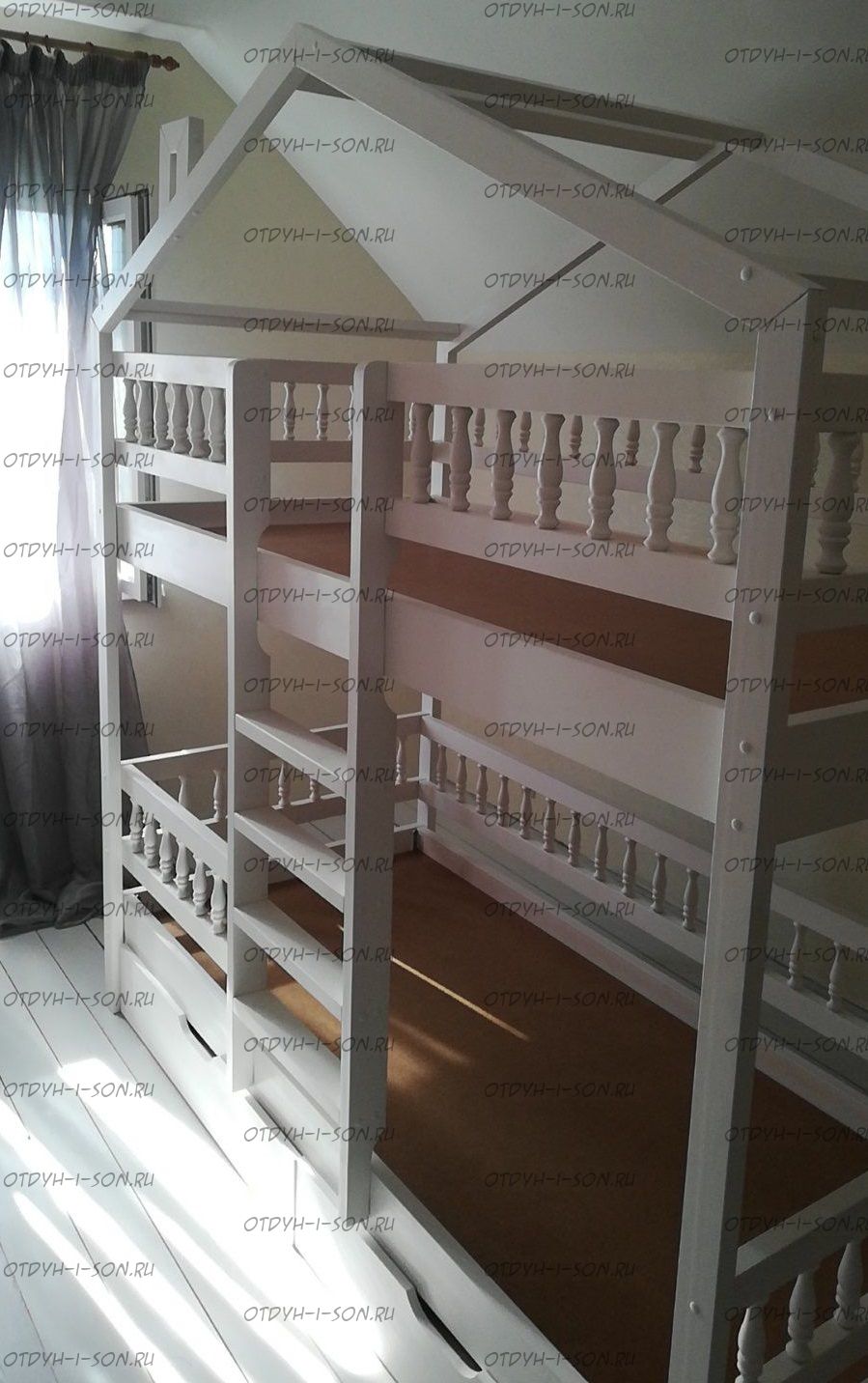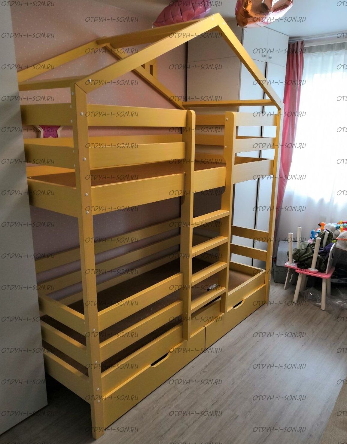 Кровать двухъярусная Домик Roof №2 Характеристики: Размер спального места: спальные места одинаковые по размеру Длина спального места: 160 см., 170 см., 180 см., 190 см., 200 см. или любой другой на Ваш выбор Ширина спального места: 70 см., 80 см., 90 см. или любой другой на Ваш выбор Высота кровати: 210 см. Каркас: массив сосны, Брус 40х40 мм. Основание: поперечные брусья массив, ДВП 4-5 мм. Ящики каркас: березовая фанера 12 мм, дно ДВП 4-5 мм, выкатная система (4 колесика) - к кровати не фиксируется Ящики фасад: березовая мебельная фанера 12-16 мм, массив сосны У данной модели лестница изготавливается посередине фронтальной стороны кровати или с торцов кровати. Покрытие: Sayerlack (Италия), Renner (Италия) Внимание: возможно увеличение высоты бортиков кровати! Цвет: орех, бук, венге, груша, дуб, каштан, клен, красное дерево, махагон, ольха, сосна, белый (эмаль), слоновая кость (эмаль)