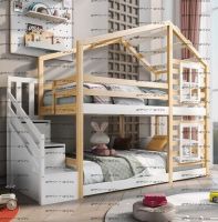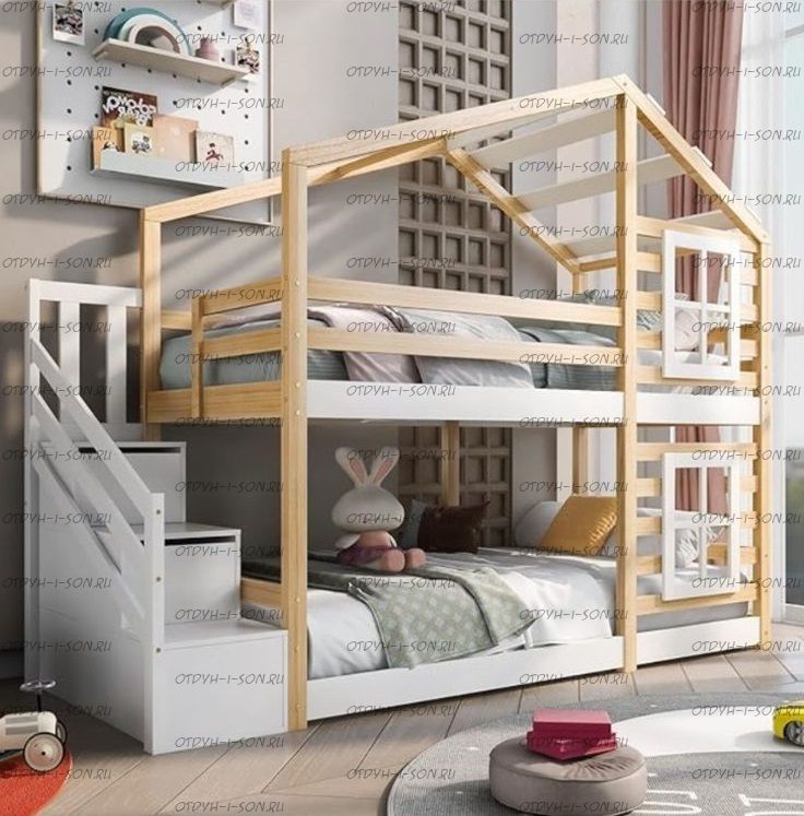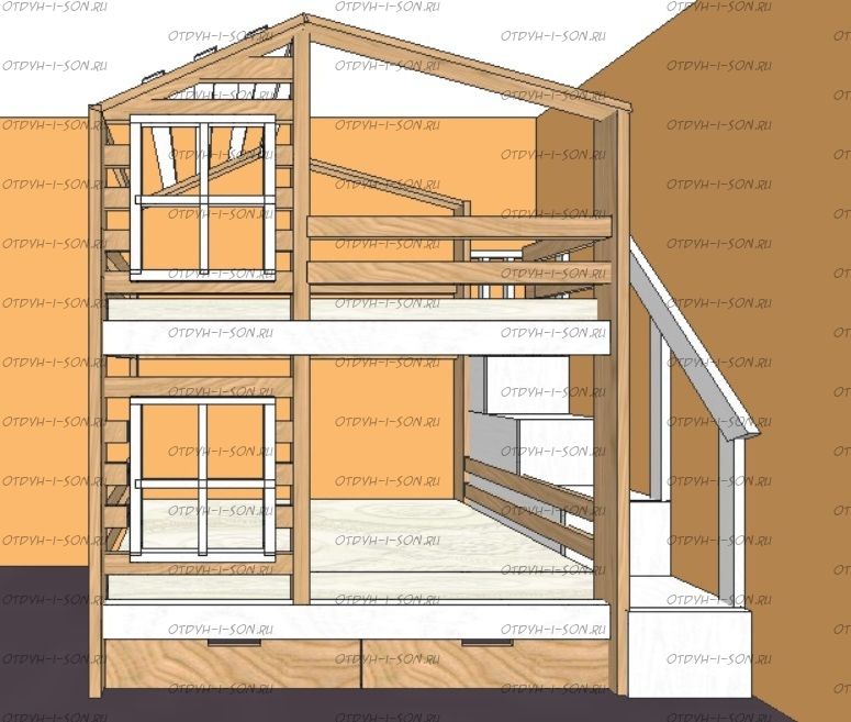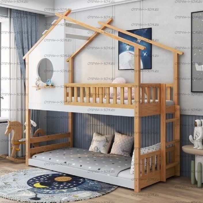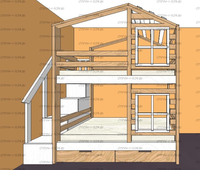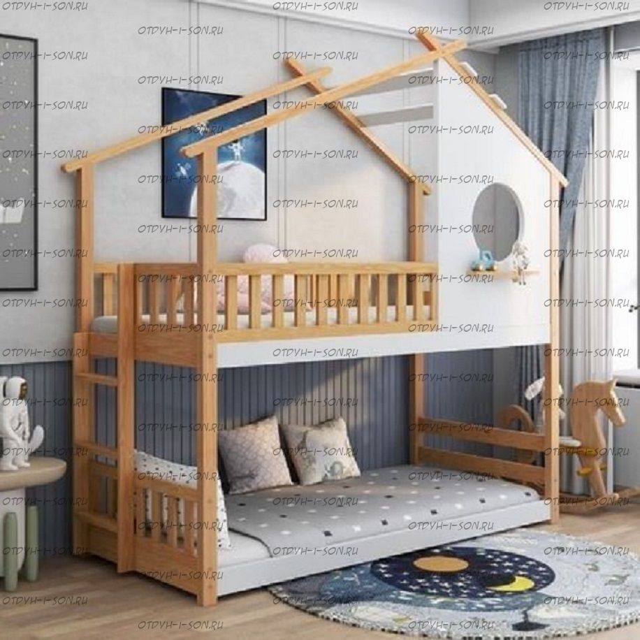 Кровать двухъярусная Домик Roof Комплектация: Кровать двухъярусная Домик Лестница Ящики подкроватные Характеристики: •Размеры верхнего спального места: 80х160 см.,90х180 см.,90х200 см.и любые другие •Размеры нижнего спального места: 80х160 см.,90х180 см.,90х200 см.и любые другие •Габаритные размеры: любые •Материалы: массив сосны •Цвет покрытия: любая цветовая гамма (таблица палитры Ral);