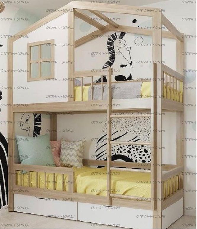 Кровать-чердак Домик Roof №6А Характеристики: Размер спального места: спальные места одинаковые по размеру Длина спального места: 160 см., 170 см., 180 см., 190 см., 200 см. или любой другой на Ваш выбор Ширина спального места: 70 см., 80 см., 90 см. или любой другой на Ваш выбор Каркас: массив сосны, Брус 40х80 мм. Основание: поперечные брусья массив, ДВП 4-5 мм. Ящики каркас: березовая фанера 12 мм, дно ДВП 4-5 мм, выкатная система (4 колесика) - к кровати не фиксируется Ящики фасад: березовая мебельная фанера 12-16 мм, массив сосны Покрытие: Sayerlack (Италия), Renner (Италия) Внимание: возможно увеличение высоты бортиков кровати! Цвет: орех, бук, венге, груша, дуб, каштан, клен, красное дерево, махагон, ольха, сосна, белый (эмаль), слоновая кость (эмаль)