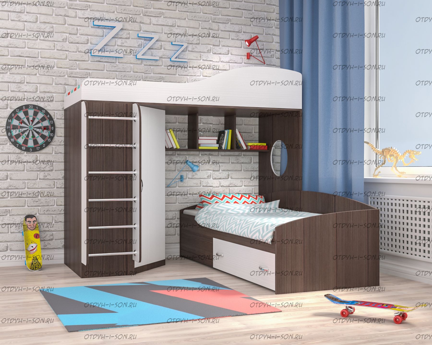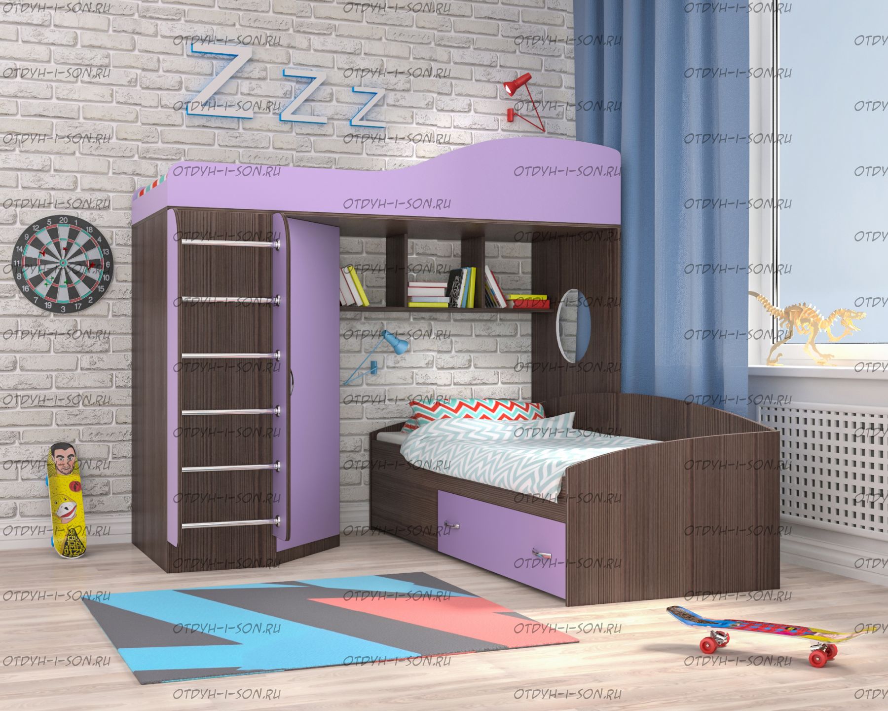 Кровать двухъярусная Кадет №2 рекомендуется для детей возрастом от 2,5 до 8 лет. Комплектация: Кровать-чердак КАДЕТ Встроенный, вместительный шкаф, Нижнеярусная, односпальная кровать с выдвижными ящиками металлическая лестница Характеристики: Верхнее спальное место 80х190 см. Нижнее спальное место: 90х200 см. Габаритные размеры: Размер: Д2564 × Г832 х В1716 мм. Высота нижнего бортика общая (фактическая): 200(110) мм. Вес: 240 кг Объем: 0,4м3 Кол-во пакетов: 5шт. Материалы: кромка АБС Цвета корпуса: Дуб молочный, венге, орех донской, вишня, бодего темный, белое дерево. Цвета фасада: розовый, оранжевый, ирис, лайм, голубой, зеленый, бежевый, красный, бодего темный, дуб молочный, венге, вишня, орех донской, белое дерево.