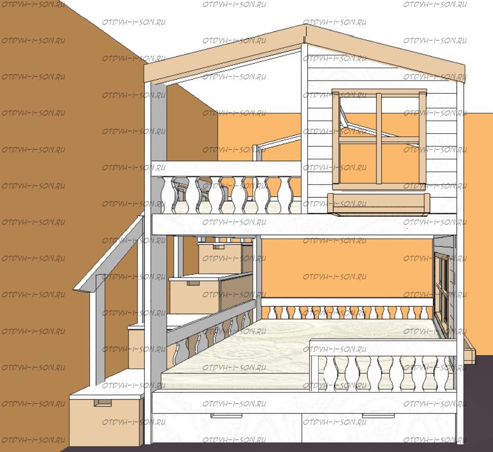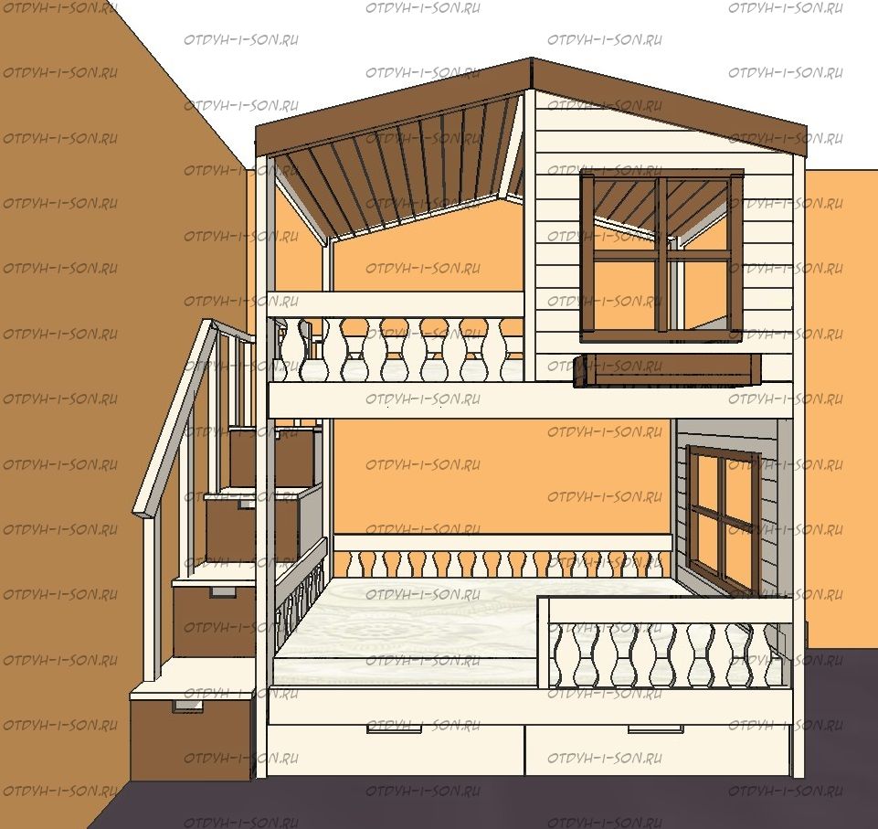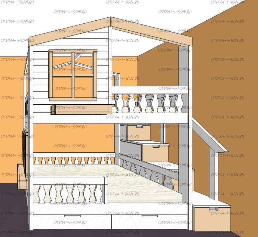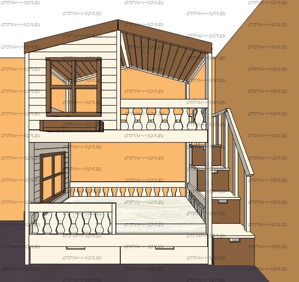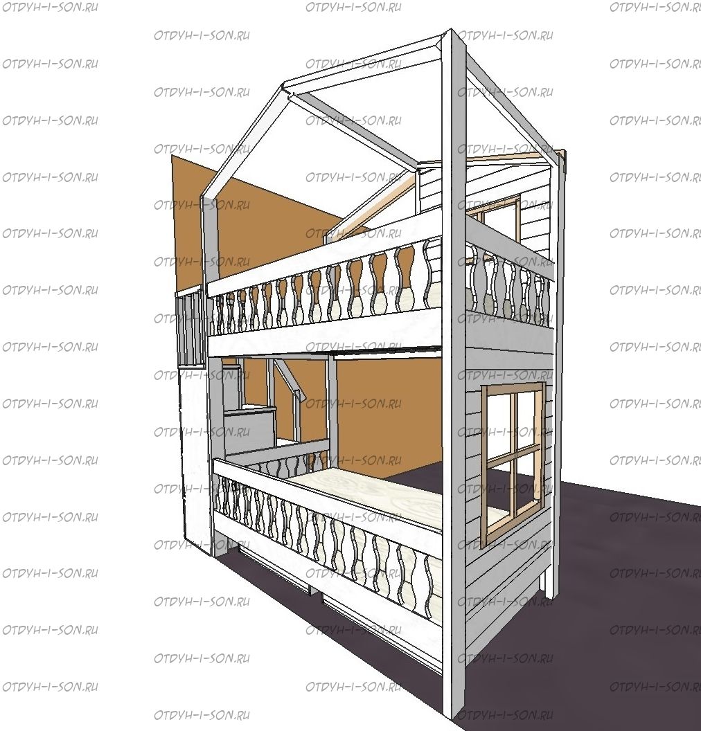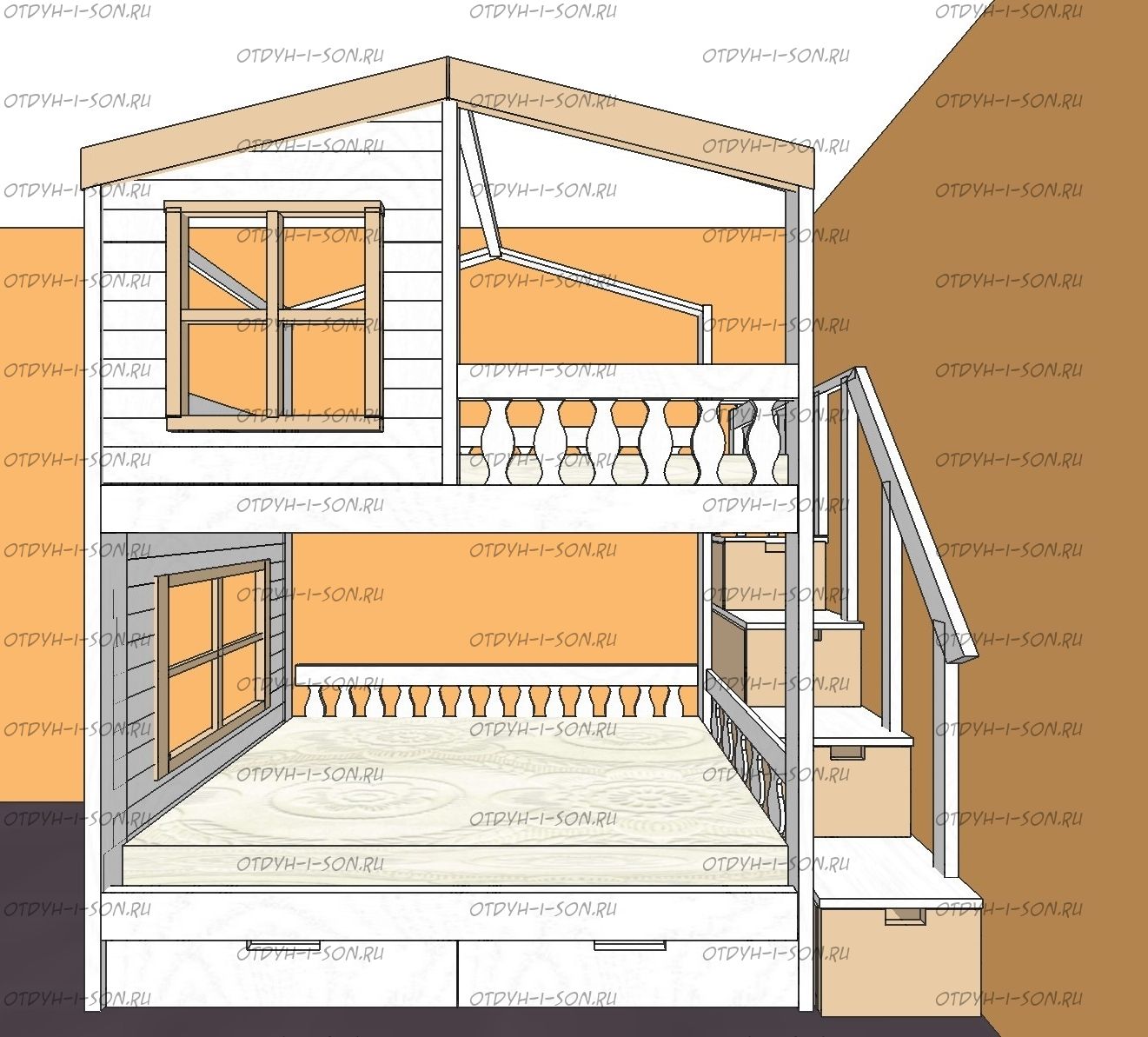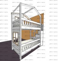 Кровать двухъярусная, Кровать-домик Roof может быть изготовлена с кроватью для новорожденного внизу или как трехъярусная кровать, а также в любых размерах и цветах. Характеристики: любые размеры, цвета любые материалы: массив сосны, березы или бука